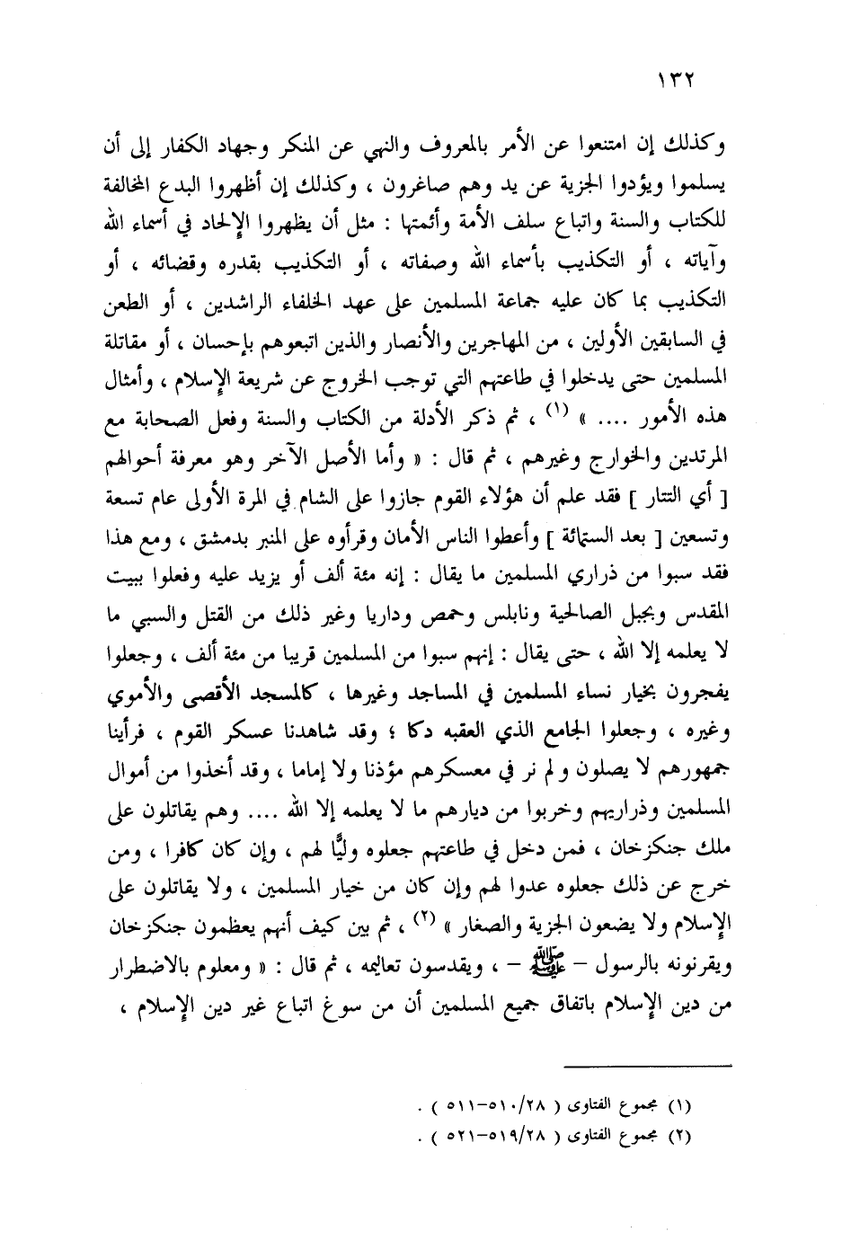 وكذلك إن امتنعوا عن الأمر بالمعروف والنهي عن المنكر وجهاد الكفار إلى أن يسلموا ويؤدوا الجزية عن يد وهم صاغرون، وكذلك إن أظهروا البدع الخالفة للكتاب والسنة واتباع سلف الأمة وأئمتها: مثل أن يظهروا الالحاد في أسماء الله وآياته، أو التكذيب بأحماء الله وصفاته، أو التكذيب بقدره وقضائه، أو التكذيب بما كان عليه جماعة المسلمين على عهد الخلفاء الراشدين، أو الطعن في السابقين الأولين، من المهاجرين والأنصار والذين اتبعوهم بإحسان، أو مقاتلة المسلمين حتى يدخلوا في طاعتهم التى توجب الخروج عن شريعة الإسلام، وأمثال هذه الأمور.... " (¬1) ، ثم ذكر الأدلة من الكتاب والسنة وفعل الصحابة مع المرتدين والخوارج وغيرهم، ثم قال: " وأما الأصل الآخر وهو معرفة أحوالهم [أي التتار] فقد علم أن هؤلاء القوم جازوا على الشام في المرة الأولى عام تسعة وتسعين [بعد الستمائة] وأعطوا الناس الأمان وقرأوه على المنبر بدمشق، ومع هذا فقد سبوا من ذراري المسلمين ما يقال: إنه مئة ألف أو يزيد عليه وفعلوا ببيت المقدس وبجبل الصالحية ونابلس وحمص وداريا وغير ذلك من القتل والسبي ما لا يعلمه إلا الله، حتى يقال: إنهم سبوا من المسلمين قريبا من مئة ألف، وجعلوا يفجرون بخيار نساء المسلمين في المساجد وغيرها، كالمسجد الأقصى والأموي وغيره، وجعلوا الجامع الذي العقبه دكا؛ وقد شاهدنا عسكر القوم، فرأينا جمهورهم لا يصلون ولم نر في معسكرهم مؤذنا ولا إماما، وقد أخذوا من أموال المسلمين وذراريهم وخربوا من ديارهم ما لا يعلمه إلا الله.... وهم يقاتلون على ملك جنكزخان، فمن دخل في طاعتهم جعلوه ولما لهم، وإن كان كافرا، ومن خرج عن ذلك جعلوه عدوا لهم وإن كان من خيار المسلمين، ولا يقاتلون على الاسلام ولا يضعون الجزية والصغار " (¬2) ،