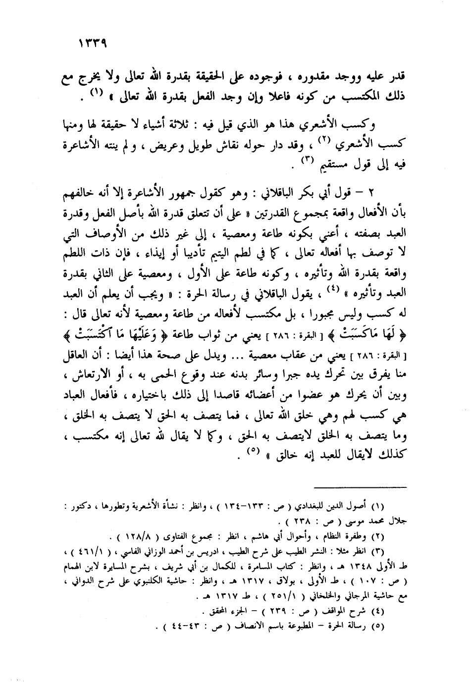 وكسب الأشعري هذا هو الذي قيل فيه: ثلاثة أشياء لا حقيقة لها ومنها كسب الأشعري (¬2) ، وقد دار حوله نقاش طوي لوعريض، ولم ينته الأشاعرة فيه إلو قول مستقيم (¬3) .