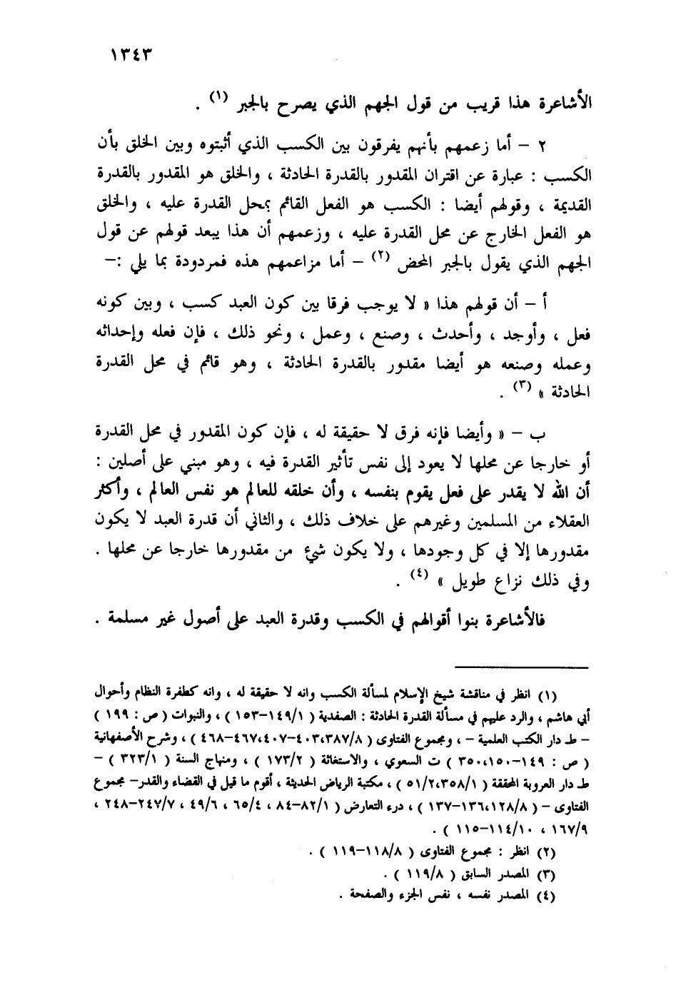 (¬1) انظر في مناقشة شيخ الإسلام لمسألة الكسب وإنه لا حقيقة له، وإنه كطفرة النظام وأحوال أبي هاشم، والرد عليهم في مسألة القدرة الحادثة: الصفدية (1/149-153) ، والنبوات (ص:199) - ط دار الكتب العلمية -، ومجموع الفتاوى (8/387، 403-407، 467-468) ، وشرح الأصفهانية (ص:149-150، 350) ت السعوي، والاستغاثة (2/173) ، ومنهاج السنة (1/323) ط دار العروبة المحققة (1/358، 2/51) ، مكتبة الرياض الحديثة، أقوم ما قيل في القضاء والقدر - مجموع الفتاوى - (8/128، 136-137) ، درء التعارض (1/82-84، 4/65، 6/49، 7/247-248، 9/167، 10/114-115) .