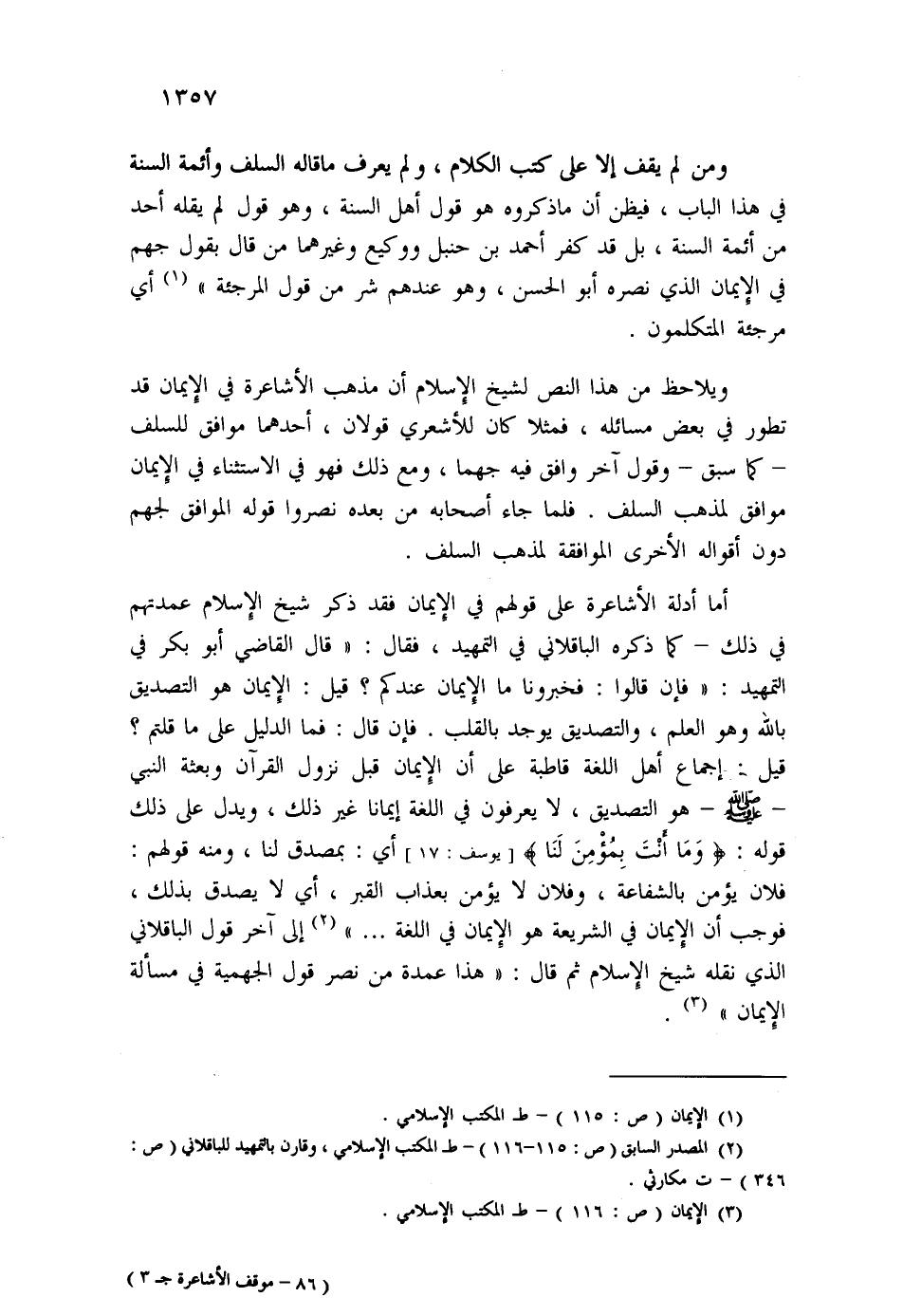 ويلاحظ من هذا النص لشيخ الإسلام أن مذهب الأشاعرة في الإيمان قد تطور في بعض مسائله، فمثلاً كان للأشعري قولان، أحدهما موافق للسلف - كما سبق - وقول آخر وافق فيه جهما، ومع ذلك فهو في الاستثناء في الإيمان موافق لمذهب السلف. فلما جاء أصحابه من بعده نصورا قوله الموافق لجهم دون أقواله الأخرى الموافقة لمذهب السلف.