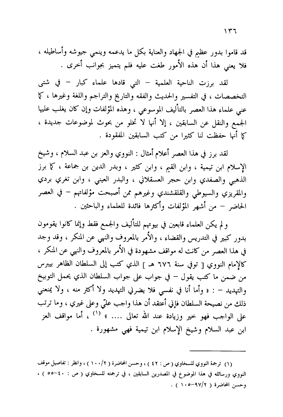 ولم يكن العلماء قابعين في بيوتهم للتأليف والجمع فقط وإنما كانوا يقومون بدور كبير في التدريس والقضاء، والأمر بالمعروف والهي عن المنكر، وقد وجد في هذا العصر من كانت له مواقف مشهودة في الأمر بالمعروف والنهي عن المنكر، كالإمام النووي [توفي سنة 676 هـ] الذي كتب إلى السلطان الظاهر بيبرس من ضمن ما كنب يقول- في جواب على جواب السلطان الذي يحمل التوبيخ والتهديد-: " وأما أنا في نفسي فلا يضرني التهديد ولا أكثر منه، ولا يمنعنى ذلك من نصيحة السلطان فإني أعتقد أن هذا واجب علي وعلى غيري، وما ترتب على الواجب فهو خير وزيادة عند الله تعالى.... " (¬1) ، أما مواقف العز ابن عبد السلام وشيخ الإسلام ابن تيمية فهي مشهورة.