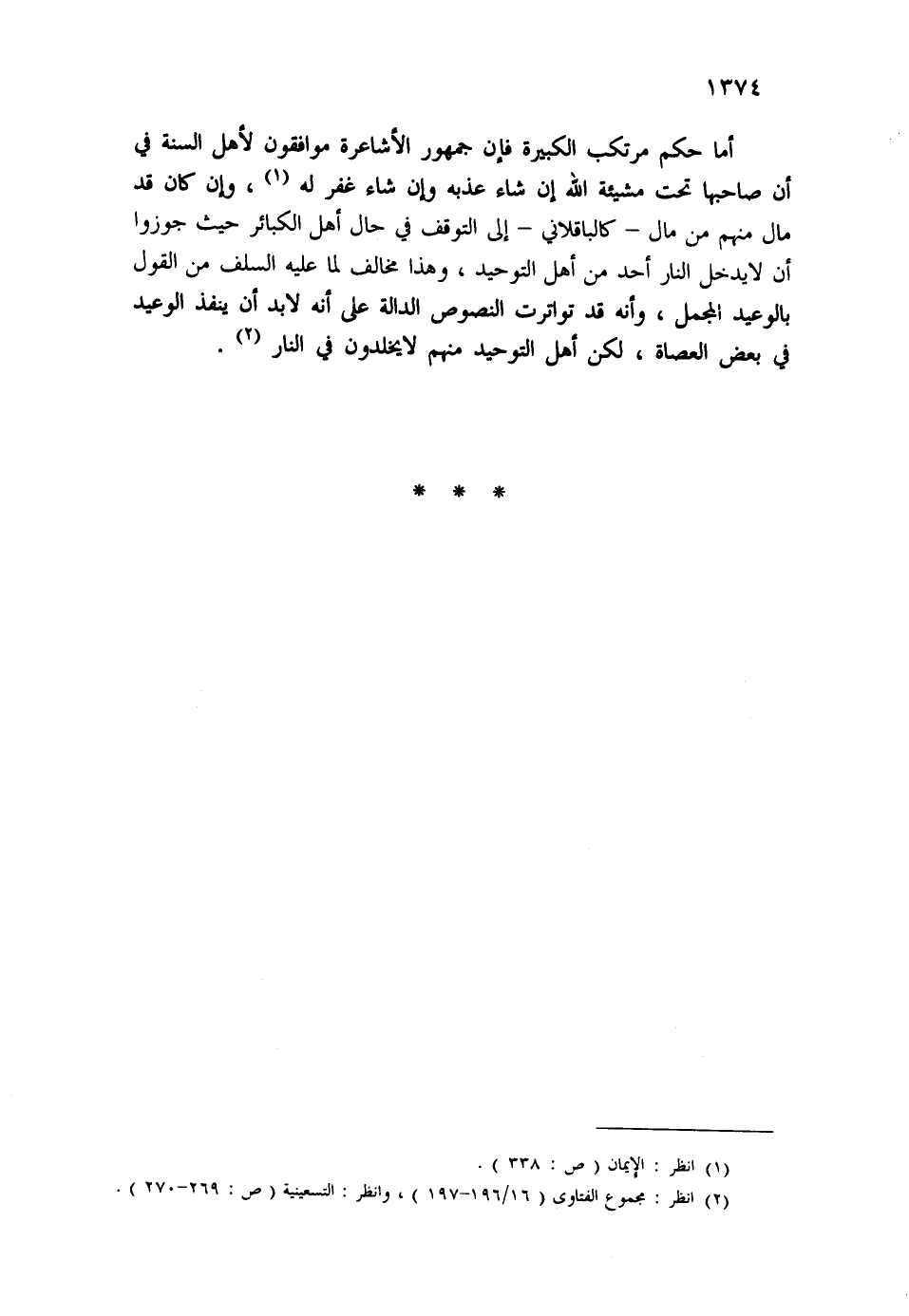 أما حكم مرتكب الجريمة فإن جمهور الأشاعرة موافقون لأهل السنة في أن صاحبها تحت مشيئة الله إن شاء الله عذبه وإن شاء غفر له (¬1) ، وإن كان قد مال منهم من مال - كالباقلاني - إلى التوقف في حال أهل الكبائر حيث جوزوا أن لا يدخل النار أحد من أهل التوحيد، وهذا مخالف لما عليه السلف من القول بالوعيد المجمل، وأنه قد تواترت النصوص الدالة على أنه لا بد أن ينفذ الوعيد في بعض العصاة، لكن أهل التوحيد منهم لا يخلدون في النار (¬2) .