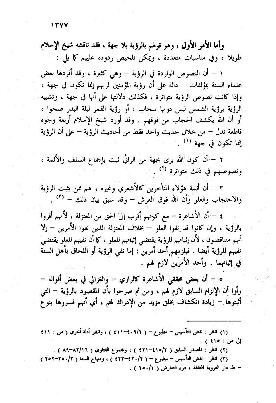 1- أن النصوص الواردة في الرؤية - وهي كثيرة، وقد أفردها بعض علماء السنة بمؤلفات - دالة على أن رؤية المؤمنين لربهم إنما تكون في جهة، وإذا كانت نصوص الرؤية متواترة، فكذلك دلالتها على أنها في جهة، وتشبيه الرؤية برؤية الشمس ليس دونها سحاب، أو رؤية القمر ليلة البدر صحوا، أو أن الله يكشف الحجاب من فوقهم. وقد أورد شيخ الإسلام أربعة وجوه قاطعة تدل - من خلال حديث واحد فقط من أحاديث الرؤية - على أن الرؤية إنما تكون في جهة (¬1) .