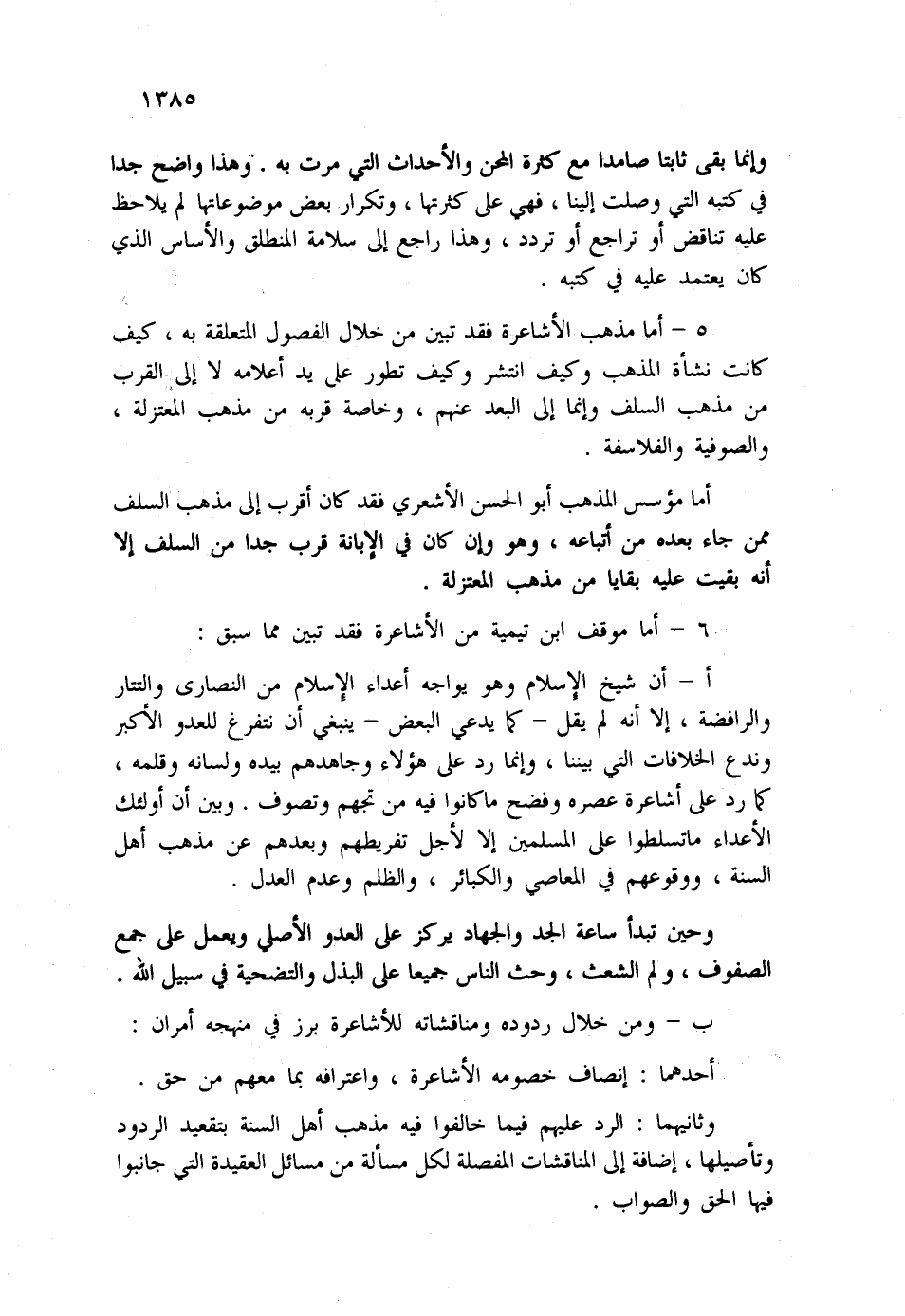5- أما مذهب الأشاعرة فقد تبين من خلال الفصول المتعلقة به، كيف كانت نشأة المذهب وكيف انتشر وكيف تطور على يد أعلام لا إلى القرب من مذهب السلف وإنما إلى البعد عنهم، وخاصة قربه من مذهب المعتزلة، والصوفية والفلاسفة.