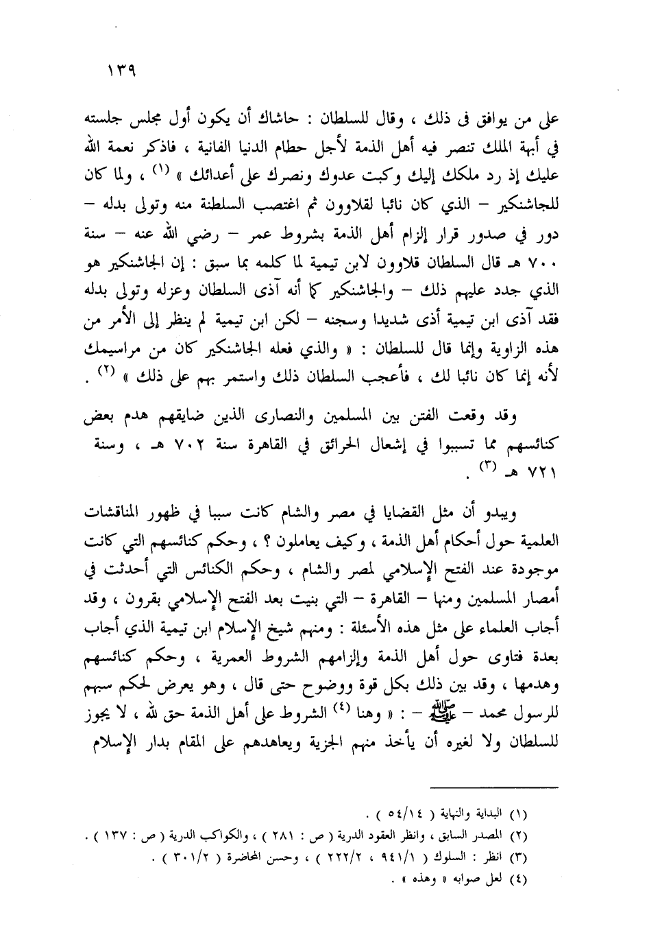 على من يوافق فى ذلك، وقال للسلطان: حاشاك أن يكون أول مجلس جلسته في أبهة الملك تنصر فيه أهل الذمة لأجل حطام الدنيا الفانية، فاذكر نعمة الله عليك إذ رد ملكك إليك وكبت عدوك ونصرك على أعدائك " (¬1) ، ولما كان للجاشنكير- الذي كان نائبا لقلاوون ثم اغتصب السلطة منه وتولى بدلهـ دور في صدور قرار إلزام أهل الذمة بشروط عمر- رضى الله عنهـ سنة 700 هـ قال السلطان قلاوون لابن تيمية لما كلمه بما سبق: إن الجاشنكير هو الذي جدد عليهم ذلك- والجاشنكير كما أنه آذى السلطان وعزله وتولى بدله فقد آذى ابن تيمية أذى شديدا وسجنهـ لكن ابن تيمية لم ينظر إلى الأمر من هذه الزاوية وإنما قال للسلطان: " والذي فعله الجاشنكير كان من مراسيمك لأنه إنما كان نائبا لك، فأعجب السلطان ذلك واستمر بهم على ذلك " (¬2) . وقد وقعت الفتن بين المسلمين والنصارى الذين ضايقهم هدم بعض كنائسهم مما تسببوا في إشعال الحرائق في القاهرة سنة 702 هـ، وسنة 721 هـ (¬3) .
