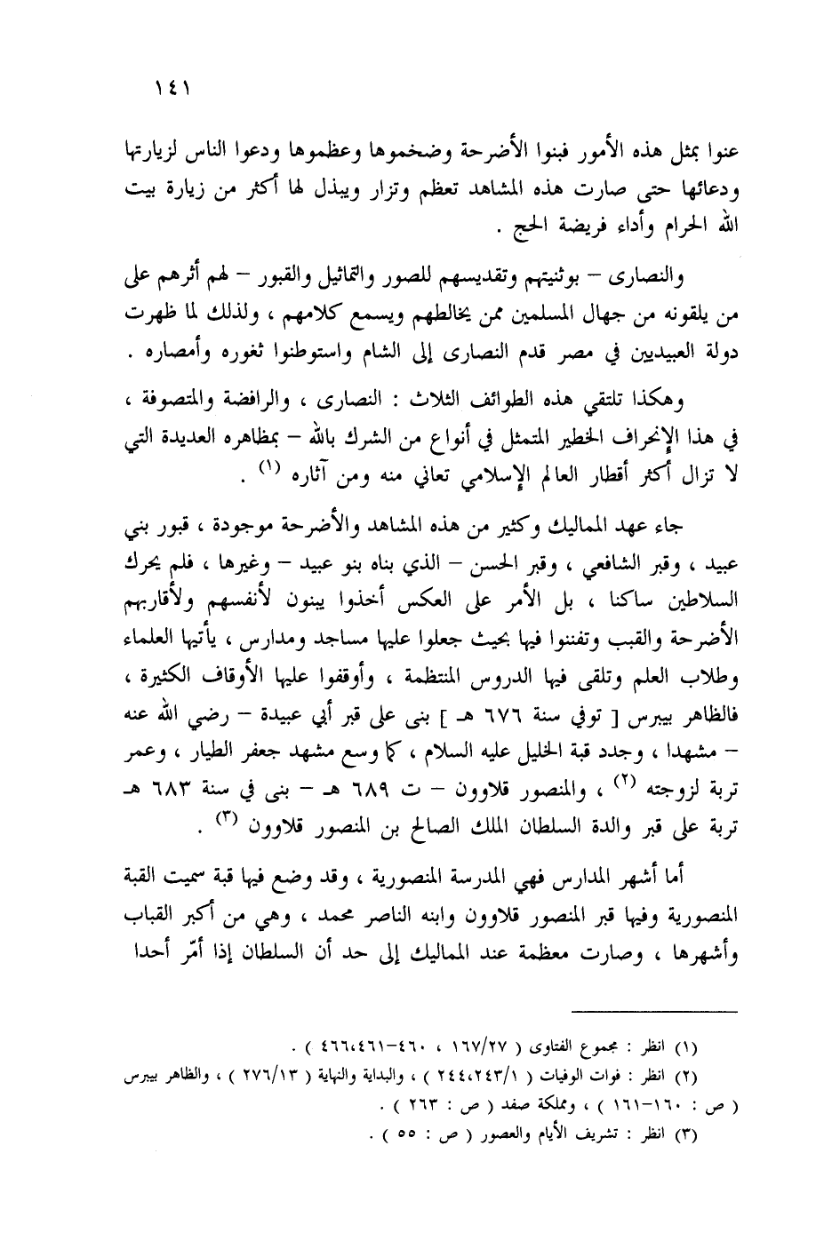 جاء عهد المماليك وكثير من هذه المشاهد والأضرحة موجودة، قبور بني عبيد، وقبر الشافعي، وقبر الحسن- الذي بناه بنو عبيد- وغيرها، فلم يحرك السلاطين ساكنا، بل الأمر على العكس أخذوا يبنون لأنفسهم ولأقاربهم الأضرحة والقبب وتفننوا فيها بحيث جعلوا عليها مساجد ومدارس، يأتيها العلماء وطلاب العلم وتلقى فيها الدروس المنتظمة، وأوقفوا عليها الأوقاف الكثيرة، فالظاهر بيبرس [توفي سنة 676 هـ] بنى على قبر أبى عبيدة- رضى الله عنه - مشهدا، وجدد قبة الخليل عليه السلام، كما وسع مشهد جعفر الطيار، وعمر تربة لزوجته (¬2) ، والمنصور قلاوون- ت 689 هـ- بنى في سنة 683 هـ تربة على قبر والدة السلطان الملك الصالح بن المنصور قلاوون (¬3) .