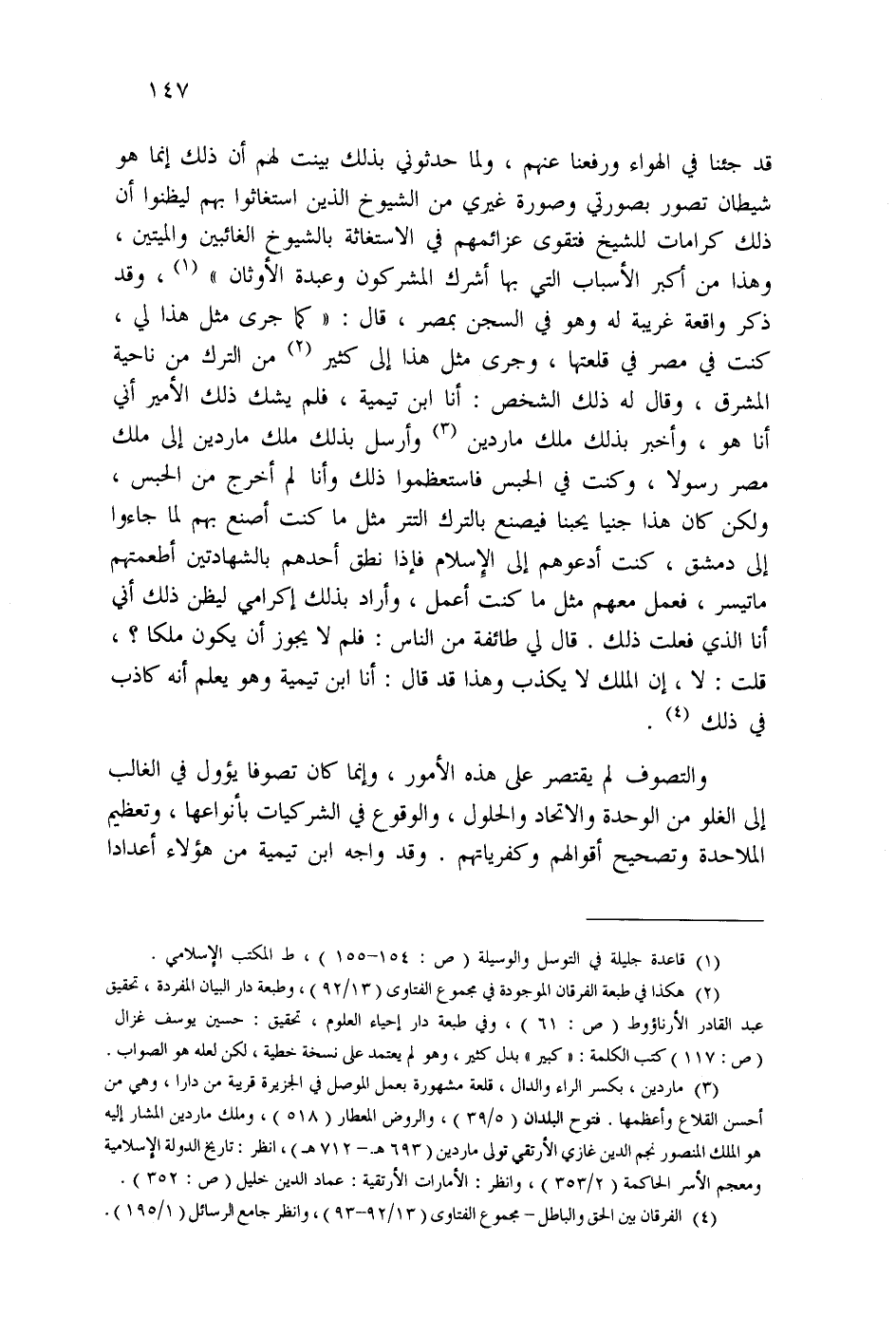 قد جئنا في الهواء ورفعنا عنهم، ولما حدثوني بذلك بينت لهم أن ذلك إنما هو شيطان تصور بصورتي وصورة غيري من الشيوخ الذين استغاثوا بهم ليظنوا أن ذلك كرامات للشيخ فتقوى عزائمهم في الاستغاثة بالشيوخ الغائبين والميتين، وهذا من أكبر الأسباب التى بها أشرك المشركون وعبدة الأوثان " (¬1) ، وقد ذكر واقعة غريبة له وهو في السجن بمصر، قال: " كما جرى مثل هذا لي، كنت في مصر في قلعتها، وجرى مثل هذا إلى كثير (¬2) من الترك من ناحية المشرق، وقال له ذلك الشخص: أنا ابن تيمية، فلم يشك ذلك الأمير أني أنا هو، وأخبر بذلك ملك ماردين (¬3) وأرسل بذلك ملك ماردين إلى ملك مصر رسولا، وكنت في الحبس فاستعظموا ذلك وأنا لم أخرج من الحبس، ولكن كان هذا جنيا يحبنا فيصنع بالترك التتر مثل ما كنت أصنع بهم لما جاءوا إلى دمشق، كنت أدعوهم إلى الإسلام فإذا نطق أحدهم بالشهادتين أطعمتهم ماتيسر، فعمل معهم مثل ما كنت أعمل، وأراد بذلك إكرامي ليظن ذلك أني أنا الذي فعلت ذلك.