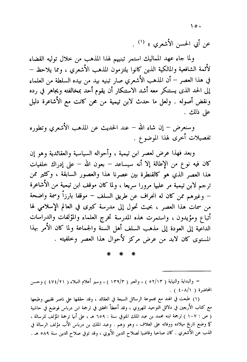 وبعد فهذا عرض لعصر ابن تيمية، وأحواله السياسية والعقائدية وهو إن كان فيه نوع من الإطالة إلا أنه سيساعد- بعون اللهـ على إدراك خلفيات هذا العصر الذي هو كالقنطرة بين عصرنا هذا والعصور السابقة، وكثير ممن ترجم لابن تيمية مر عليها مرورا سريعا، ولما كان موقف ابن تيمية من الأشاعرة - وغيرهم ممن كان له انحراف عن طريق السلف- موقفا بارزا وسمة واضحة من سمات هذا العصر، بحيث تحول إلى مدرسة كبرى في العالم الإسلامى لها أتباع ومؤيدون، واستمرت هذه المدرسة تخرج العلماء والمؤلفات والدراسات الداعية إلى العودة إلى مذهب السلف أهل السنة والجماعة ولما كان الأمر بهذا المستوى كان لابد من عرض مركز لأحوال هذا العصر وخلفيته.