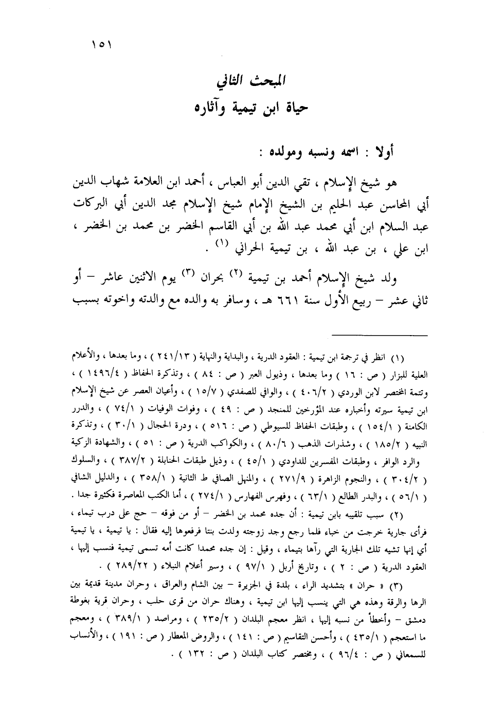 (¬1) انظر في ترجمة ابن تيمية: العقود الدرية، والبداية والنهاية (13/ 241) ، وما بعدها، والأعلام العلية للبزار (ص: 16) وما بعدها، وذيول العبر (ص: 84) ، وتذكرة الحفاظ (4/1496) ، وتتمة المختصر لابن الوردي (2/406) ، والوافي للصفدي (7/15) ، وأعيان العصر عن شيخ الإسلام ابن تيمية سيرته وأخباره عند المؤرخين للمنجد (ص: 49) ، وفوات الوفيات (1/74) ، والدرر الكامنة (1/154) ، وطبقات الحفاظ للسيوطى (ص: 516) ، ودرة الحجال (1/ 30) ، وتذكرة النبيه (2/185) ، وشذرات الذهب (6/ 80) ، والكواكب الدرية (ص:51) ، والشهادة الزكية والرد الوافر، وطبقات المفسرين للداودي (1/45) ، وذيل طبقات الحنابلة (2/387) ، والسلوك (4/2 30) ، والنجوم الزاهرة (9/ 271) ، والمنهل الصافي ط الثانية (1/358) ، والدليل الشافي (1/56) ، والبدر الطالع (1/63) ، وفهرس الفهارس (1/274) ، أما الكتب المعاصرة فكثيرة جدا.