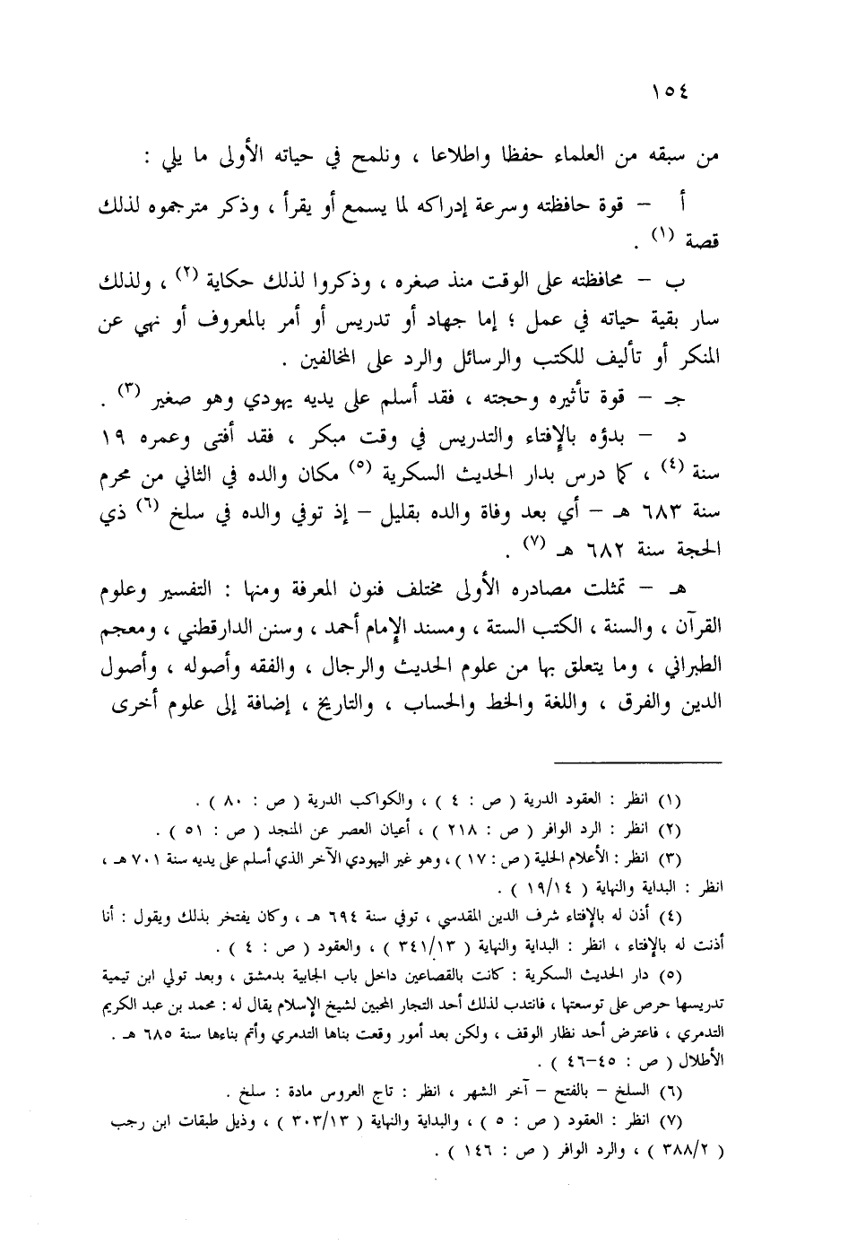 (¬7) انظر: العقود (ص5) ، والبداية والنهاية (13/ 303) ،، وذيل طبقات ابن رجب (2/ 388) ، والرد الوافر (ص146) .