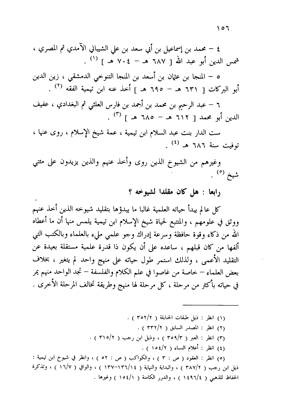 (¬5) انظر: العقود (ص: 3) ، والكواكب (ص: 52) ، وانظر في شيوخ ابن تيمية: ديل ابن رجب (2/387) ، والبداية والنهاية (14/136- 137) ، والوافي (7/16) ، وتذكرة الحفاظ للذهبي (4/1496) ، والدرر الكامنة (1/ 154) وغيرها.