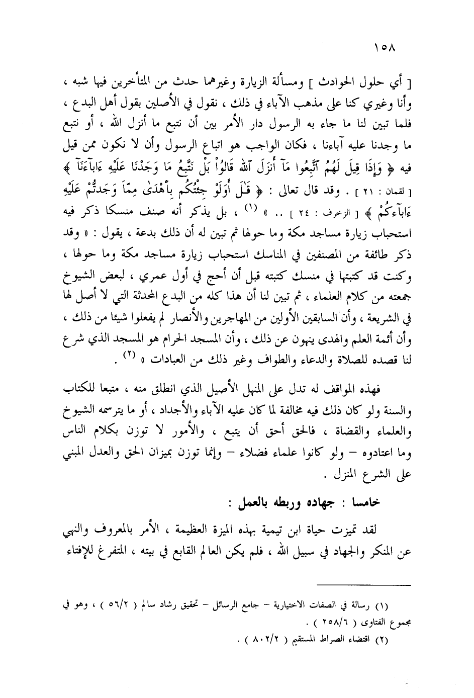 [أي حلول الحوادث] ومسألة الزيارة وغيرهما حدث من المتأخرين فيها شبه، وأنا وغيري كنا على مذهب الآباء في ذلك، نقول في الأصلين بقول أهل البدع، فلما تبين لنا ما جاء به الرسول دار الأمر بين أن نتبع ما أنزل الله، أو نتبع ما وجدنا عليه آباءنا، فكان الواجب هو اتباع الرسول وأن لا نكون ممن قيل فيه {وَإِذَا قِيلَ لَهُمُ اتَّبِعُوا مَا أَنْزَلَ اللَّهُ قَالُوا بَلْ نَتَّبِعُ مَا وَجَدْنَا عَلَيْهِ آبَاءَنَا} [لقمان:21] وقد قال تعالى: {قَالَ أَوَلَوْ جِئْتُكُمْ بِأَهْدَى مِمَّا وَجَدْتُمْ عَلَيْهِ آبَاءَكُمْ} [الزخرف:24] ... " (¬1) ، بل يذكر أنه صنف منسكا ذكر فيه استحباب زيارة مساجد مكة وما حولها ثم تبين له أن ذلك بدعة، يقول: " وقد ذكر طائفة من المصنفين في المناسك استحباب زيارة مساجد مكة وما حولها، وكنت قد كتبتها في منسك كتبته قبل أن أحج في أول عمري، لبعض الشيوخ جمعته من كلام العلماء، ثم تبين لنا أن هذا كله من البدع المحدثة التي لا أصل لها في الشريعة، وأن السابقين الأولين من المهاجرين والأنصار لم يفعلوا شيئا من ذلك، وأن أئمة العلم والهدى ينهون عن ذلك، وأن المسجد الحرام هو المسجد الذي شرع لنا قصده للصلاة والدعاء والطواف وغير ذلك من العبادات " (¬2) .
