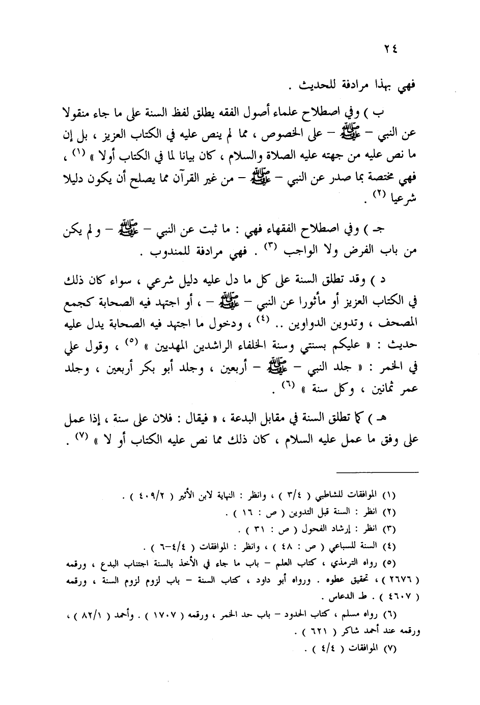 د) وقد تطلق السنة على كل ما دل عليه دليل شرعي، سواء كان ذلك في الكتاب العزيز أو مأثورا عن النبى- صلى الله عليه وسلم -، أو اجتهد فيه الصحابة كجمع المصحف، وتدوين الدواوين ... (¬4) ، ودخول ما اجتهد فيه الصحابة يدل عليه حديث: " عليكم بسنتي وسنة الخلفاء الراشدين المهديين " (¬5) ، وقول على في الخمر: " جلد النبي-صلى الله عليه وسلم- أربعين، وجلد أبو بكر أربعين، وجلد عمر ثمانين، وكل سنة " (¬6) .