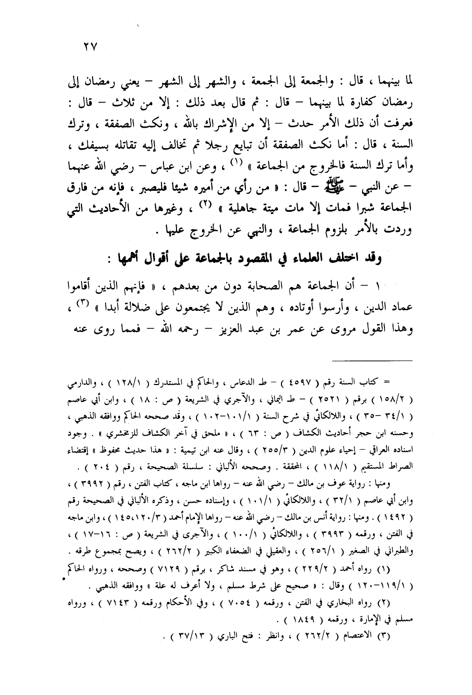أ- أن الجماعة هم الصحابة دون من بعدهم، " فإنهم الذين أقاموا عماد الدين، وأرسوا أوتاده، وهم الذين لا يجتمعون على ضلالة أبدا " (¬3) ، وهذا القول مروى عن عمر بن عبد العزيز-رحمه الله- فمما روى عنه