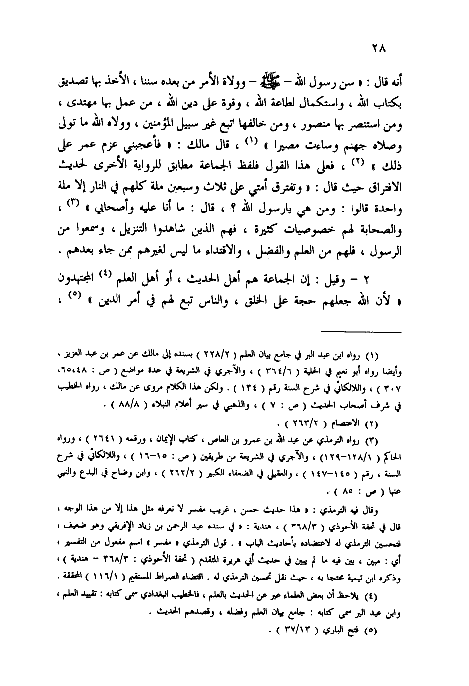 أنه قال: (سن رسول الله - صلى الله عليه وسلم - وولاة الأمر من بعده سننا، الأخذ بها تصديق بكتاب الله، واستكمال لطاعة الله، وقوة على دين الله، من عمل بها مهتدى، ومن استنصر بها منصور، ومن خالفها اتبع غير سبيل المؤمنين، وولاه الله ما تولى وصلاه جهنم وساءت مصيرا" (¬1) ، قال مالك: (فأعجبني عزم عمر على ذلك" (¬2) ، فعلى هذا القول فلفظ الجماعة مطاب للرواية الأخرى لحديث الافتراق حيث قال: (وتفترق أمتي على ثلاث وسبعبن ملة كلهم في النار الا ملة واحدة قالوا: ومن هي يارسول الله؟، قال: ما أنا عليه وأصحابي" (¬3) ،