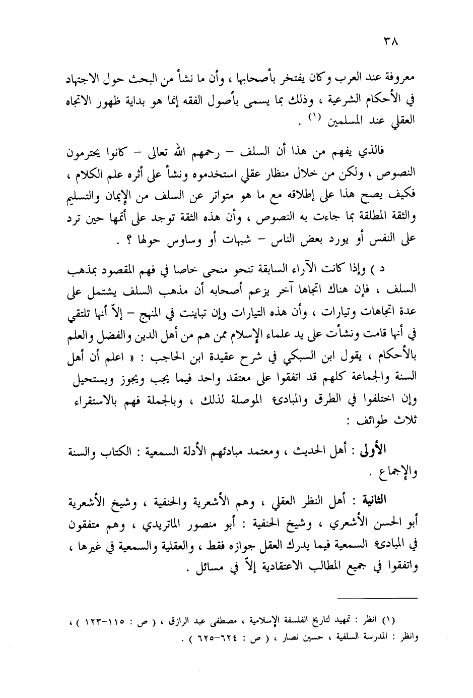د) وإذا كانت الآراء السابقة تنحو منحى خاصا في فهم المقصود بمذهب السلف، فإن هناك اتجاها آخر يزعم أصحابه أن مذهب السلف يشتمل على عدة اتجاهات وتيارات، وأن هذه التيارات وإن تباينت في المنهج- إلأ أنها تلتقى في أنها قامت ونشأت على يد علماء الإسلام ممن هم من أهل الدين والفضل والعلم بالأحكام، يقول ابن السبكي في شرح عقيدة ابن الحاجب: " اعلم أن أهل السنة والجماعة كلهم قد اتفقوا على معتقد واحد فيما يجب ويجوز ويستحيل وإن اختلفوا في الطرق والمبادى الموصلة لذلك، وبالجملة فهم بالاستقراء ثلاث طوائف: