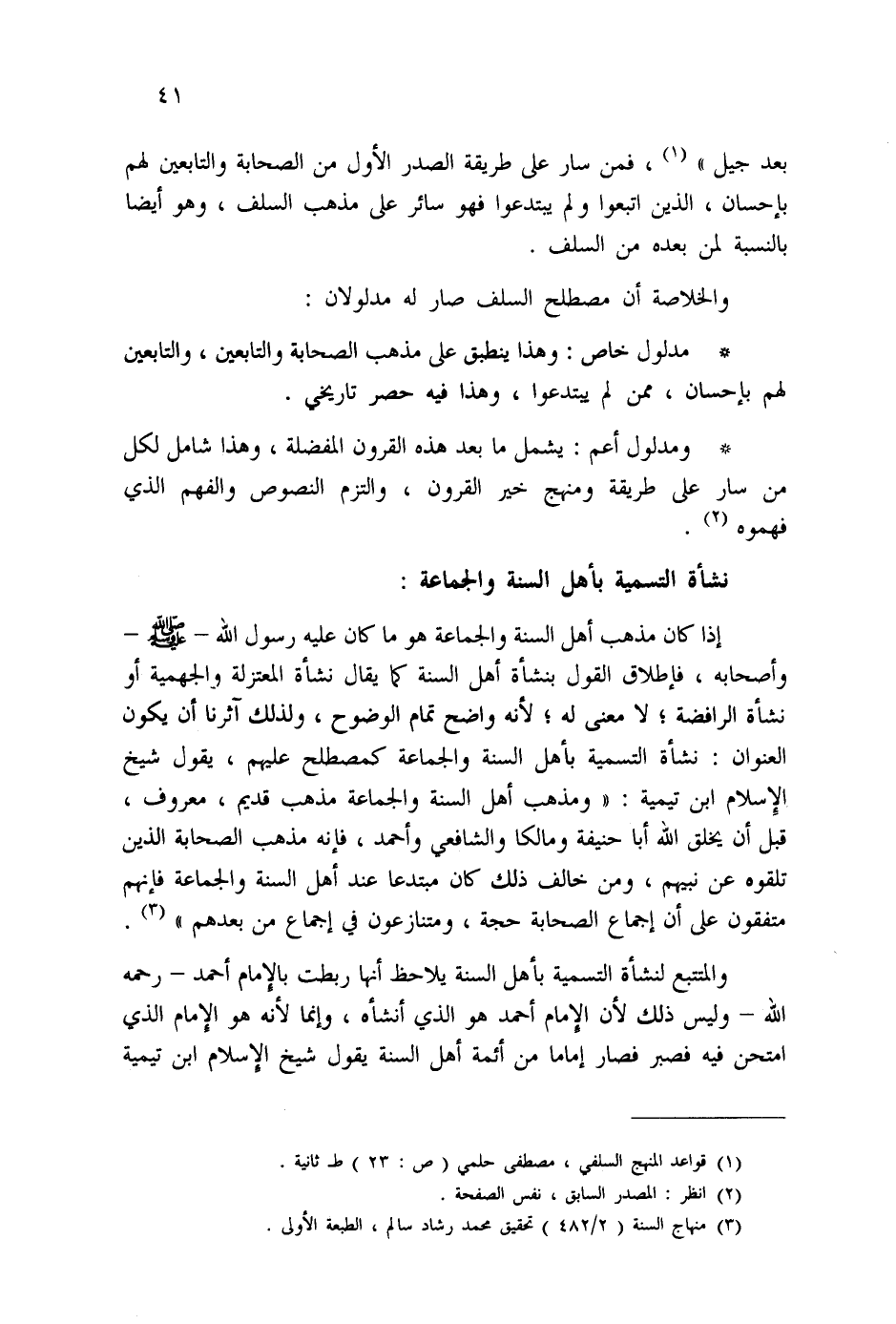 بعد جيل " (¬1) ، فمن سار على طريقة الصدر الأول من الصحابة والتابعين لهم بإحسان، الذين اتبعوا ولم يبتدعوا فهو سائر على مذهب السلف، وهو أيضا بالنسبة لمن بعده من السلف.