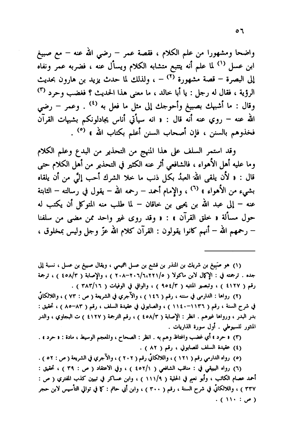 واضحا ومشهورا من علم الكلام، فقصة عمر- رضي الله عنهـ مع صبيغ ابن عسل (¬1) لما علم أنه يتتبع متشابه الكلام ويسأل عنه، فضربه عمر ونفاه إلى البصرة- قصة مشهورة (¬2) -، لذلك لما حدث يزيد بن هارون بحديث الرؤية، فقال له رجل: يا أبا خالد، ما معنى هذا الحديث؟ فغضب وحرد (¬3) وقال: ما أشبهك بصبيغ وأحوجك إلى مثل ما فعل به (¬4) . وعمر- رضي الله عنهـ روي عنه أنه قال: " إنه سيأقي أناس يجادلونكم بشبهات القرآن فخذوهم بالسنن، فإن أصحاب السنن أعلم بكتاب الله " (¬5) .