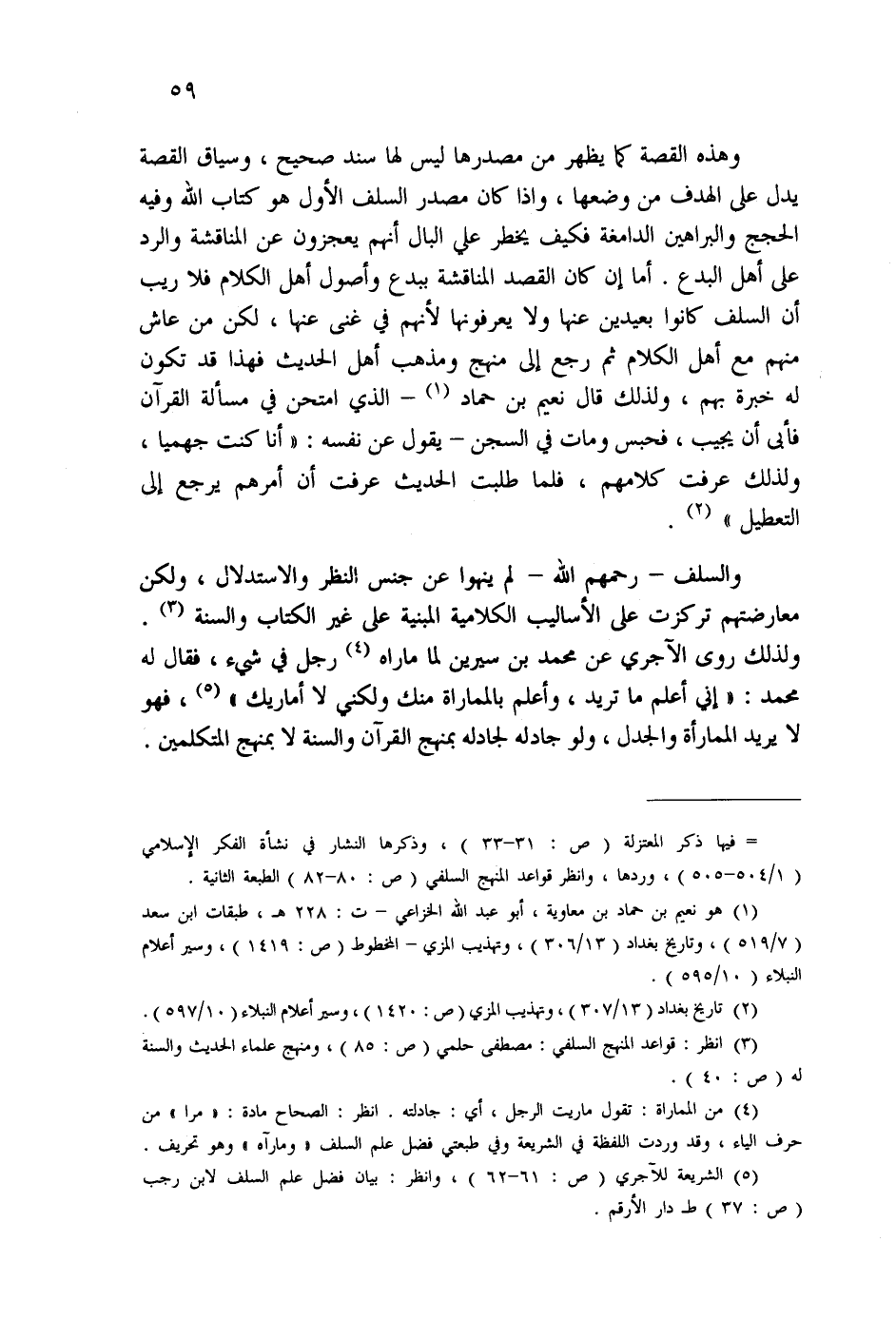 وهذه القصة كما يظهر من مصدرها ليس لها سند صحيح، وسياق القصة يدل على الهدف من وضعها، واذا كان مصدر السلف الأول هو كتاب الله وفيه الحجج والبراهين الدامغة فكيف يخطر على البال أنهم يعجزون عن المناقشة والرد على أهل البدع. أما إن كان القصد المناقشة ببدع وأصول أهل الكلام فلا ريب أن السلف كانوا بعيدين عنها ولا يعرفونها لأنهم في غنى عنها، لكن من عاش منهم مع أهل الكلام ثم رجع إلى منهج ومذهب أهل الحديث فهذا قد تكون له خبرة بهم، ولذلك قال نعيم بن حماد (¬1) - الذى امتحن في مسألة القرآن فأبى أن يجيب، فحبس ومات في السجن- يقول عن نفسه: " أنا كنت جهميا، ولذلك عرفت كلامهم، فلما طلبت الحديث عرفت أن أمرهم يرجع إلى التعطيل " (¬2) .