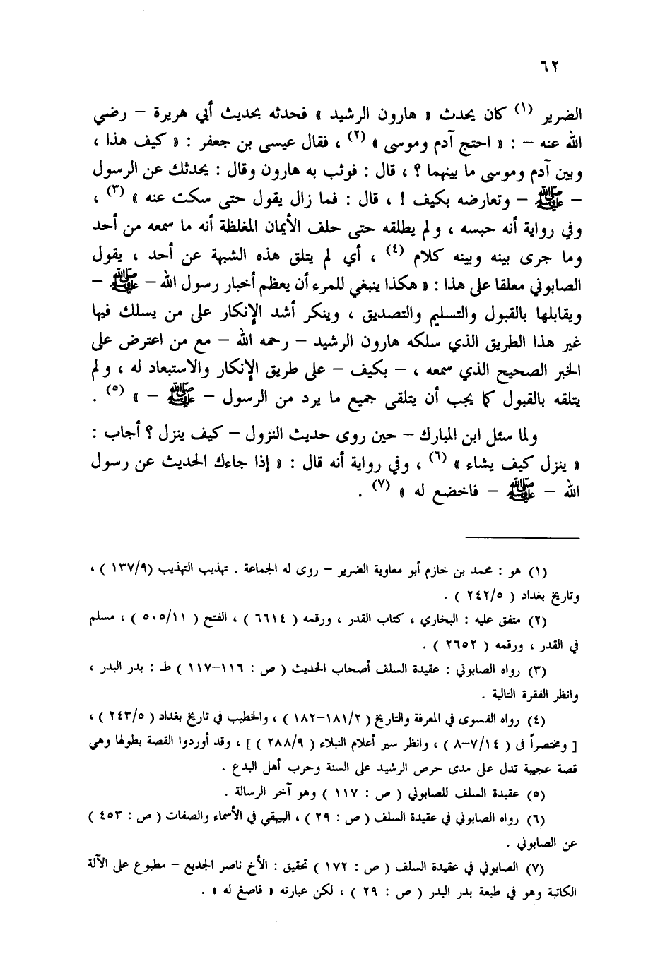 (¬7) الصابوني في عقيدة السلف (ص: 172) تحقيق: الأخ ناصر الجديع- مطبوع على الآلة الكاتبة وهو في طبعة بدر البدر (ص: 29) ، لكن عبارته " فاصغ له".