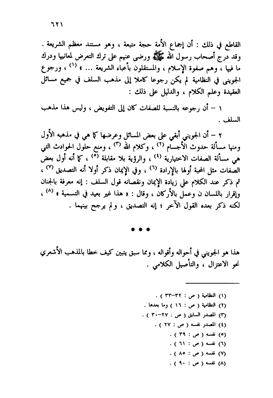 هذا هو الجويني في أحواله وأقواله، ومما سبق يتبين كيف خطا بالمذهب الأشعري نحو الاعتزال، والتأصيل الكلامي.
