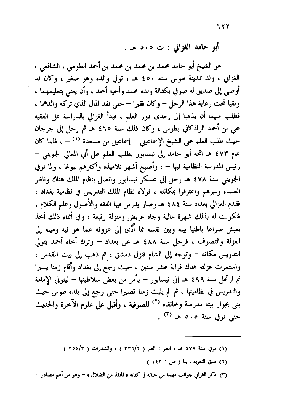 (¬3) ذكر الغزالي جوانب مهمة من حياته في كتابه " المنقذ من الضلال " وهو من أهم المصادر ترجمته، انظره: (ص:77) وما بعدها - ت تحقيق صليبا عياد- وانظر: تبيين كذب المفتري (ص:291) ، المنتظم (9/168) ، وفيات الأعيان (4/216) ، المستفاد (ص:127) ، وسير أعلام النبلاء (19/322) ، وطبقات السبكي (6/191) ، والوافي (1/274) ، واتحاف السادة المتقين (1/6) ، والتاج المكلل (ص: 388) ، والطبقات العلية في مناقب الشافعية للواسطي [ترجمة الغزالي] طبعت ضمن كتاب الأعسم الفيلسوف الغزالي ص: 153-194) وغيرها، أما الكتب المعاصرة فكثيرة جداً.