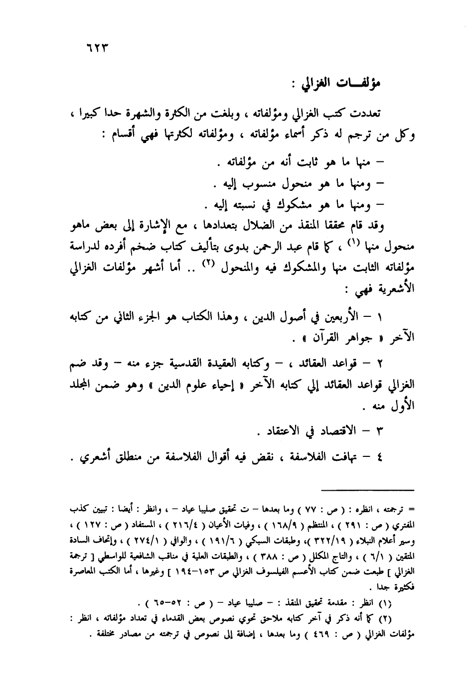 (¬2) كما أنه ذكر في آخر ملاحق تحوي نصوص بعض القدماء في تعداد مؤلفاته: انظر: مؤلفات الغزالي (ص: 469) ، وما بعدها، إضافة إلى نصوص في ترجمته من مصادر مختلفة.