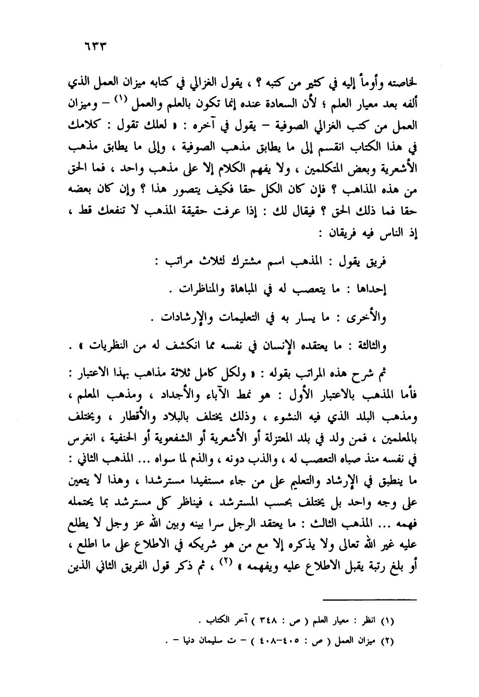 ثم شرح هذه المراتب بقوله: " ولكل كامل ثلاثة مذاهب بهذا الاعتبار: فأما المذهب بالاعتبار الأول: هو نمط الآباء والأجداد، ومذهب المعلم، ومذهب البلد الذي فيه النشوء، وذلك يختلف بالبلاد والأقطار، ويختلف بالمعلمين، فمن ولد في بلد المعتزلة أو الأشعرية أو الشفعوية أو الحنفية، انغرس في نفسه منذ صباه التعصب له، والذب دونه، والذم لما سواه ... المذهب الثاني: ما ينطبق في الإرشاد والتعليم على من جاء مستفيداً مسترشداً، وهذا لا يتعين على وجه واحد بل يختلف بحسب المسترشد، فيناظر كل مسترشد بما يحتمله فهمه.. المذهب الثالث: ما يعتقد الرجل سراً بينه وبين الله عزوجل لا يطلع عليه غير الله تعالى ولا يذكره إلا مع من هو شريكه في الإطلاع على ما اطلع، أو بلغ رتبة يقبل الاطلاع عليه ويفهمه " (¬2) ، ثم ذكر قول الفريق الثاني الذين