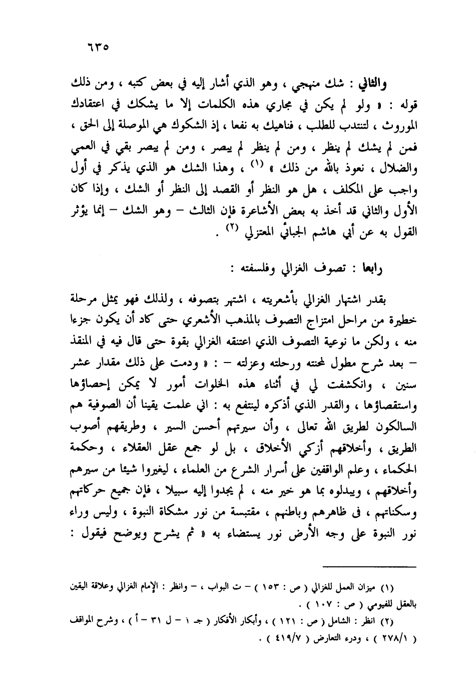 والثاني: شك منهجي، وهو الذي أشار إليه في بعض كتبه، ومن ذلك قوله: " ولو لم يكن في مجاري هذه الكلمات إلا ما يشكك في اعتقادك الموروث، لتنتدب للطلب، فناهيك به نفعاً، إذ الشكوك هي الموصلة إلى الحق، فمن لم يشك لم ينظر، ومن لم ينظر لم يبصر، ومن لم يبصر بقي في العمى والضلال، نعوذ بالله من ذلك " (¬1) ، وهذا الشك هو الذي يذكر في أول واجب على المكلف، هل هو النظر أو القصد إلى النظر أو الشك، وإذا كان الأول والثاني قد أخذ به بعض الأشاعرة فإن الثالث - وهو الشك- إنما يؤثر القول به عن أبي هاشم الجبائي المعتزلي (¬2) .