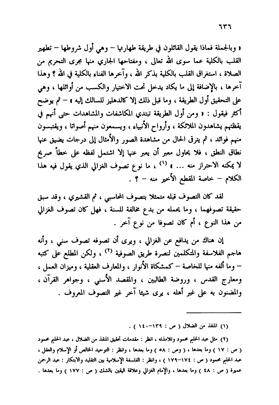 (¬2) مثل عبد الحليم محمود وتلامذته، انظر: مقدمات تحقيق المنقذ من الضلال، عبد الحليم محمود (ص: 17) ، وما بعدها، (ص: 58) ، وما بعدها، وانظر: التوحيد الخالص أو الإسلام والعقل، عبد الحليلم محمود (ص: 174-179) ، وانظر: الفلسفة الإسلامية بين التقليد والابتكار: عبد الرحمن عميرة (ص: 48) ، وما بعدها، والإمام الغزالي وعلاقة اليقين بالشك (ص: 177) ، وما بعدها.