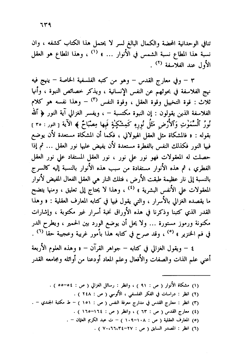 3- وفي معارج القدس - وهو من كتبه الفلسفية الخاصة - ينهج فيه نهج الفلاسفة في بحوثهم عن النفس الإنسانية، ويذكر خصائص النبوة، وأنها ثلاث: قوة التخيل وقوة العقل، وقوة النفس (¬3) - وهذا نفسه هو كلام الفلاسفة الذين يقولون: إن النبوة مكتسبة -، ويفسر الغزالي آية النور {اللَّهُ نُورُ السَّمَاوَاتِ وَالْأَرْضِ مَثَلُ نُورِهِ كَمِشْكَاةٍ فِيهَا مِصْبَاحٌ الْمِصْبَاحُ} (النور:35) ، بقوله: " فالمشكاة مثل العقل الهيولاني، فكما أن المشكاة مستعدة لأن يوضع فيها النور فكذلك النفس بالفطرة مستعدة لأن يفيض عليها نور العقل ... ثم إذا حصلت له المعقولات فهو نور على نور، نور العقل المستفاد على نور العقل الفطري، ثم هذه الأنوار مستفادة من سبب هذه الأنوار بالنسبة إليه كالسرج بالنسبة إلى نار عظيمة طبقت الأرض، فتلك النار هي العقل الفعال المفيض لأنوار المعقولات على الأنفس البشرية " (¬4) ، وهذا لا يحتاج إلى تعليق، ومنها يتضح ما يقصده الغزالي بالأسرار، والتي يقول فيها في كتابه المعارف العقلية: " وهذا القدر الذي كتبنا وذكرنا في هذه الأوراق نخبة أسرار غير مكتوبة، وإشارات مكنونة ورموز مستورة.. ولا يحل أن يوضع الورد بين الحمير، ويطرح الدر في فم الخنزير" (¬5) ، وقد صرح في كتابه هذا بأمور غريبة وعجيبة حقاً (¬6) .