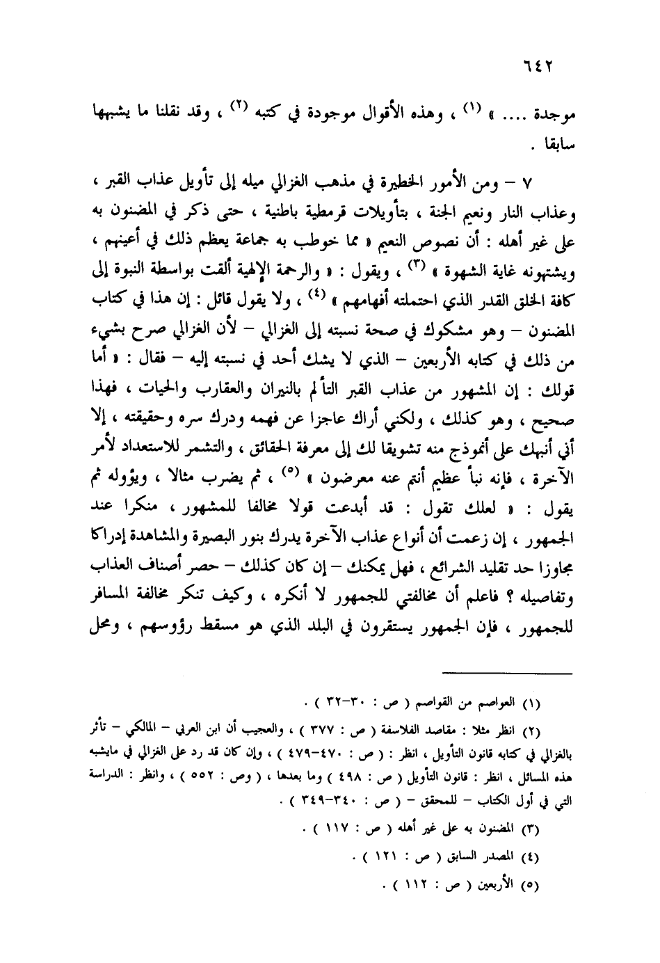(¬2) انظر مثلاً: مقاصد الفلاسفة (ص: 377) ، والعجيب أن ابن العربي - المالكي - تأثر بالغزالي في كتابه قانون التأويل، (ص: 470-479) ، وإن كان قد رد على الغزالي في ما يشبه هذه المسائل، انظر: قانون التأويل (ص: 498) ، وما بعدها (ص: 552) ، وانظر: الدراسة التي في أول الكتاب - للمحقق - (ص: 340-349) .