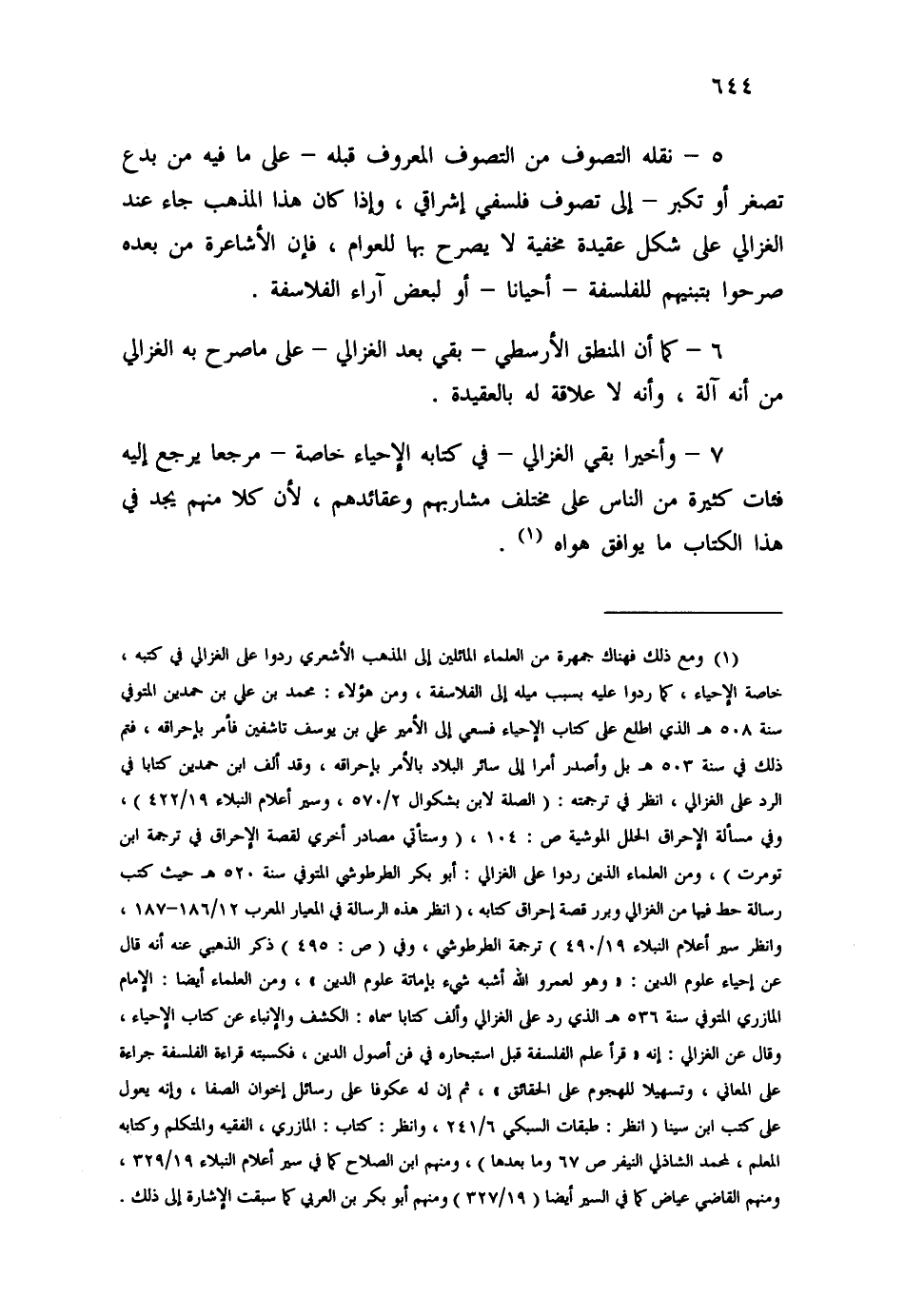 (¬1) ومع ذلك فهناك جمهرة من العلماء المائلين إلى المذهب الأشعري ردوا على الغزالي في كتبه، خاصة الإحياء، كما ردوا عليه بسبب ميله إلى الفلاسفة، ومن هؤلاء: محمد بن علي بن حمدين المتوفى سنة 508 هـ، الذي اطلع على كتاب الإحياء فسعي إلى الأمير علي بن يوسف تاشفين فأمر بإحراقه، فتم ذلك في سنة 503هـ، بل وأصدر أمراً إلى سائر البلاد بالأمر وإحراقه، وقد ألف ابن حمدين كتاباً في الرد على الغزالي، انظر في ترجمته: (الصلة لابن بشكوال 2/570، وسير أعلام النبلاء 19/422) ، وفي مسألة الإحراق الحال الموشية ص: 104، (وسيأتي مصادر أخرى لقصة= =الإحراق في ترجمة ابن تومرت) ، ومن العلماء الذين ردوا على الغزالي: أبو بكر الطرطوشي المتوفى سنة 520هـ، حيث كتب رسالة حط فيها من الغزالي وبرر قصة إحراق كتابه، (انظر: هذه الرسالة في المعيار المعرب 12/186-187، وانظر سير أعلام النبلاء 19/490) ، ترجمة الطرطوشي، وفي (ص: 495) ، ذكر الذهبي عنه أنه قال عن إحياء علوم الدين: " وهو لعمرو الله أشبه شيء بإماتة علوم الدين"، ومن العلماء أيضاً: الإمام المازري المتوفى سنة 536هـ، الذي رد على الغزالي وألف كتاباً سماه: الكشف والإنباء عن كتاب الإحياء، وقال عن الغزالي: إنه: " قرأ علم الفلسفة قبل استبحاره في فن أصول الدين، فكسبته قراءة الفلسفة جراءة على المعاني، وتسهيلاً للهجوم على الحقائق "، ثم إن له عكوفاً على رسائل إخوان الصفا، وإنه يعول على كتب ابن سينا (انظر: طبقات السبكي 6/241، وانظر: كتاب: المازري، الفقيه والمتكلم وكتابه المعلم، لمحمد الشاذلي النيفر ص: 67 وما بعدها) ، ومنهم ابن صلاح كما في سير أعلام النبلاء 19/329، ومنهم القاضي عياض كما في السير أيضاً (19/327) ، ومنهم أبو بكر بن العربي كما سبقت الإشارة إلى ذلك.