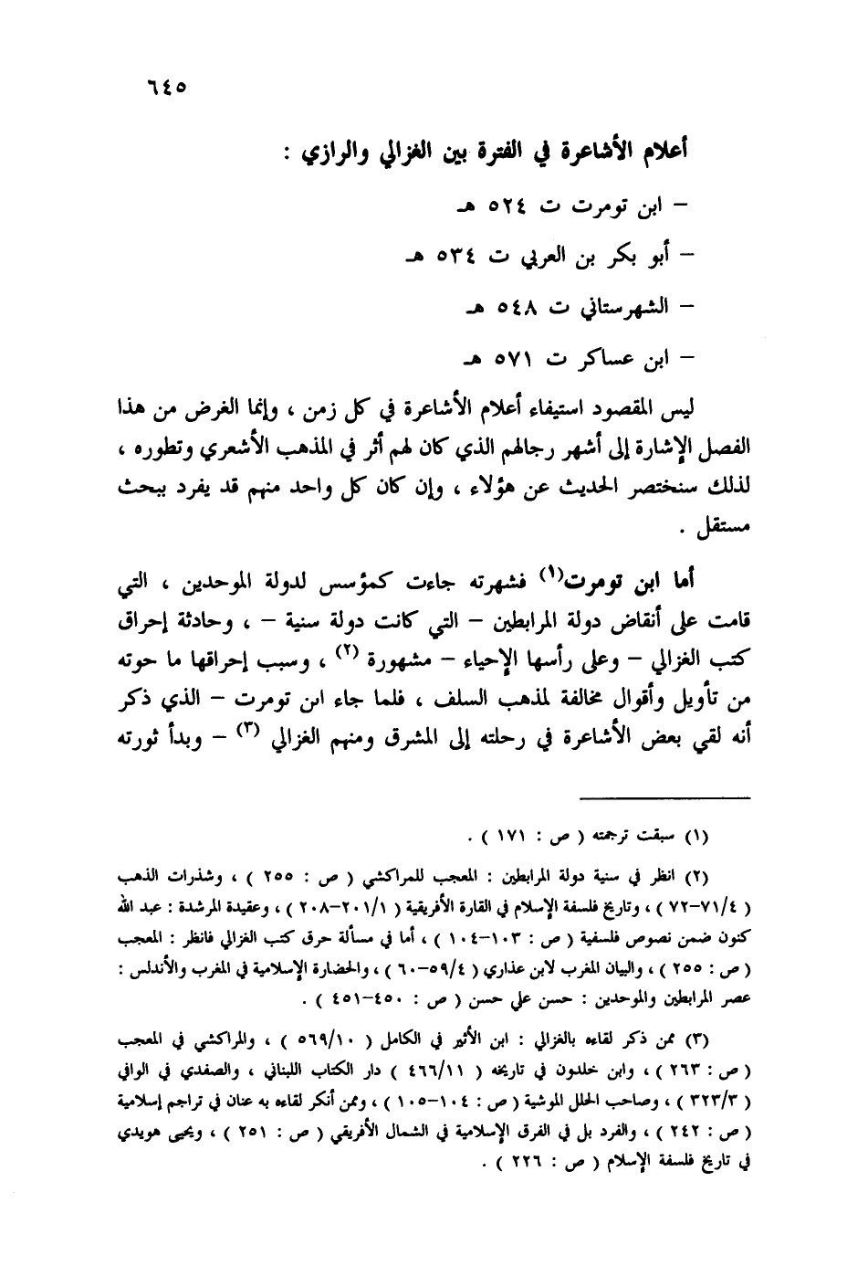 (¬3) ممن ذكر لقاءه بالغزالي: ابن الأثير في الكامل (10/569) ، والمراكشي في المعجب (ص: 263) ، وابن خلدون في تاريخه (11/466) ، دار الكتاب اللبناني، والصفدي في الوافي (3/323) ، وصاحب الحلل الموشية (ص: 104-105) ، وممن أنكر لقاءه به عنان في تراجم إسلامية (ص: 242) ، والفرد بل في الفرق الإسلامية في الشمال الأفريقي (ص: 251) ، ويحيى هويدي في تاريخ فلسفة الإسلام (ص: 226) .