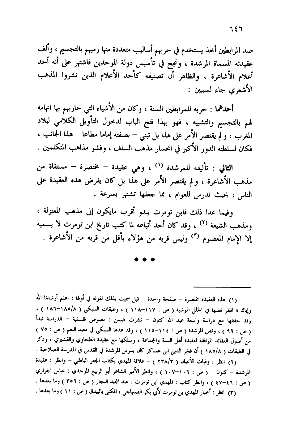 وفيما عدا ذلك فابن تومرت يبدو أقرب ما يكون إلى مذهب المعتزلة، ومذهب الشيعة (¬2) ، وقد كان أحد أتباعه لما كتب تاريخ ابن تومرت لا يسميه إلا الإمام المعصوم (¬3) وليس قربه من هؤلاء بأقل من قربه من الأشاعرة.