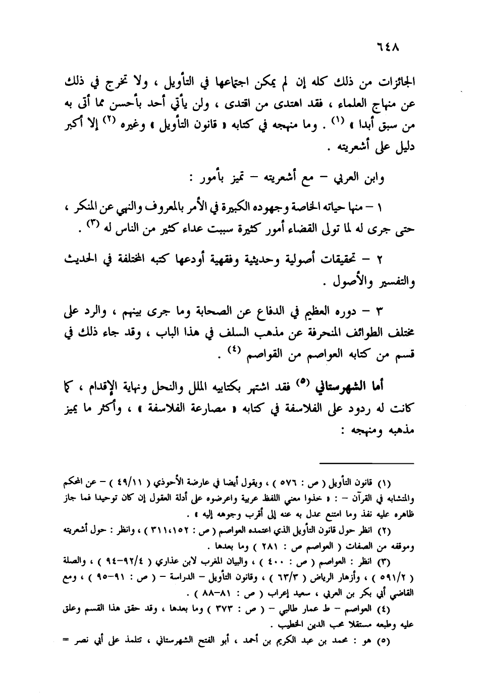 (¬2) انظر حول قانون التأويل الذي اعتمده العواصم (ص: 152-311) ، وانظر: حول أشعريته وموقفه من الصفات (العواصم ص: 281) وما بعدها.