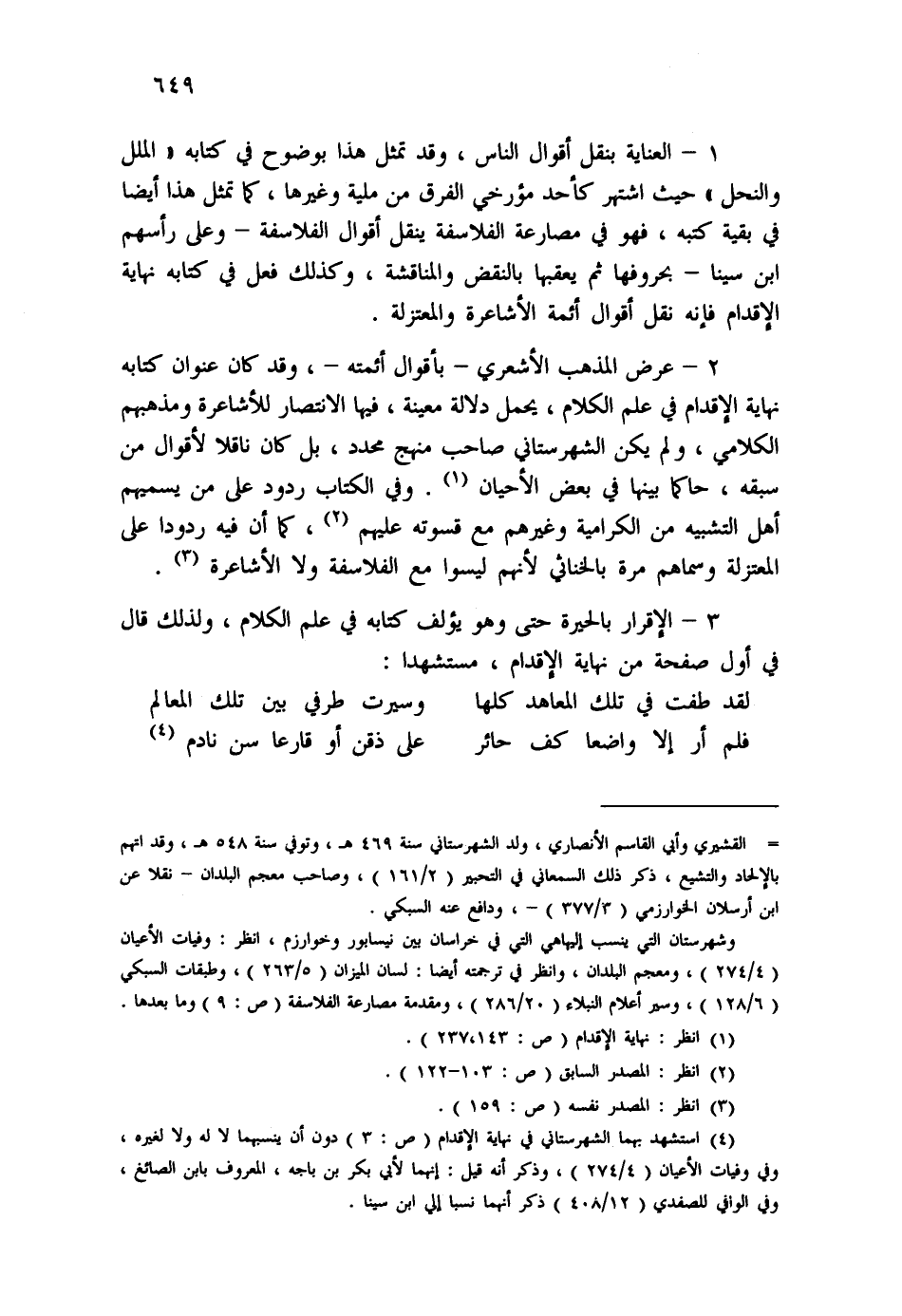 2- عرض المذهب الأشعري - بأقوال أئمته - وقد كان عنوان كتابه نهاية الإقدام في علم الكلام، يحمل دلالة معينة، فيها الانتصار للأشاعرة ومذهبهم الكلامي، ولم يكن الشهرستاني صاحب منهج محدد، بل كان ناقلاً لأقوال من سبقه، حاكماً بينها في بعض الأحيان (¬1) ، وفي الكتاب ردود على من يسميهم أهل التشبيه من الكرامية وغيرهم مع قسوته عليهم (¬2) ، كما أن فيه ردوداً على المعتزلة وسماهم مرة بالخناثي لأنهم ليسوا مع الفلاسفة ولا الأشاعرة (¬3) .