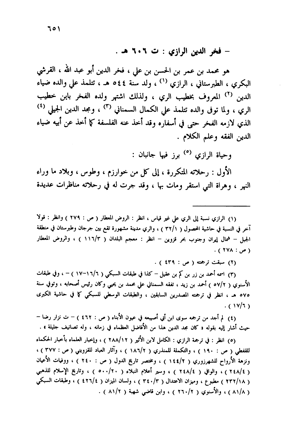 (¬5) انظر: في ترجمة الرازي: الكامل لابن الأثير (12/288) ، وإخبار العلماء بأخبار الحكماء للقفطي (ص: 190) ، والتكملة للمنذري (2/186) ، وآثار العباد للقزويني (ص:377) ، ونزهة الأرواح للشهرزوري (2/144) ، ومختصر تاريخ الدول (ص: 240) ، ووفيات الأعيان (4/248) ، والوافي (4/248) ، وسير أعلام النبلاء (20/500) ، وتاريخ الإسلام للذهبي (18/232) ، مطبوع، وميزان الاعتدال (3/340) ، ولسان الميزان (4/426) ، وطبقات السبكي (8/18) ، والأسنوي (2/260) ، وابن قاضي شهبة (2/81) .