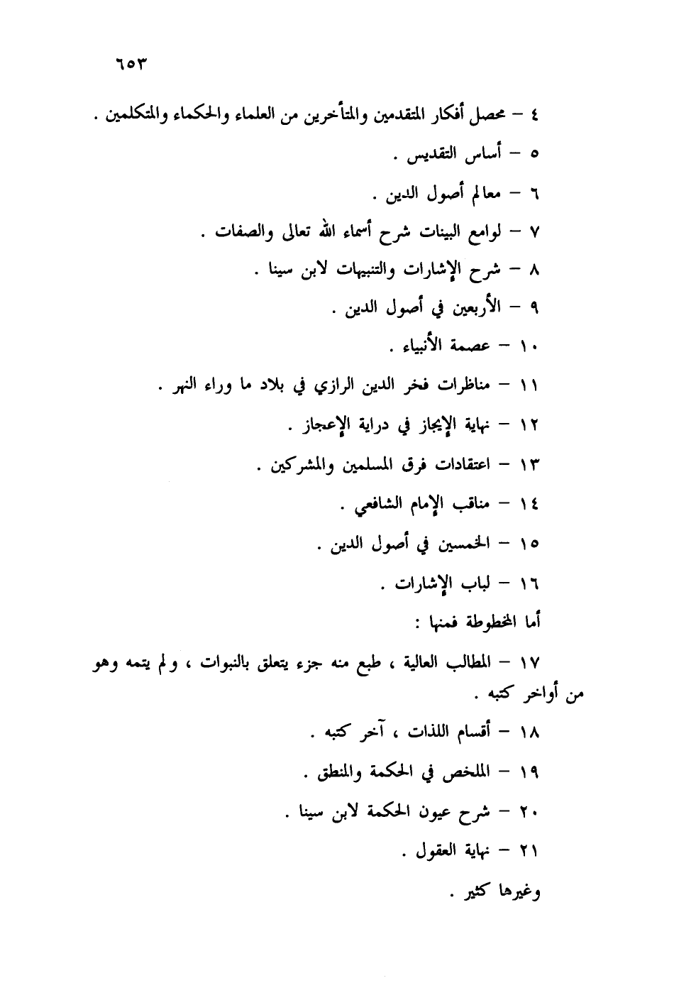 17- المطالب العالية، طبع منه جزء يتعلق بالنبوات، ولم يتمه وهو من أواخر كتبه.