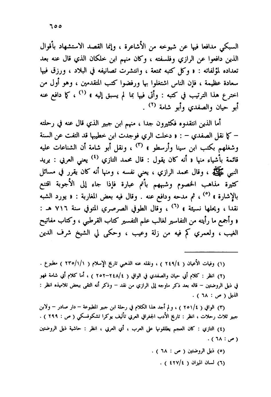 (¬2) انظر: كلام أبي حيان والصفدي في الوافي (4/248-252) ، أما كلام أبي شامة فهو في ذيل الروضتين - قاله بعد ذكر ما وجه إلى الرازي من نقد - وذكر أنه التقى ببعض تلاميذه انظر: الذبل (ص: 68) .