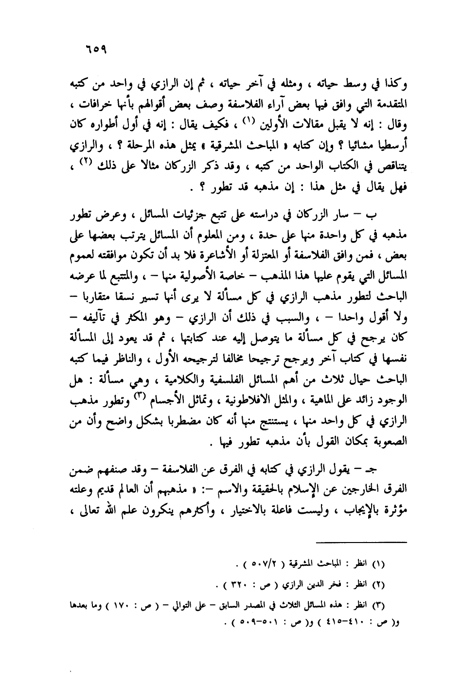 وكذا في وسط حياته، ومثله في آخر حياته، ثم إن الرازي في واحد من كتبه المتقدمة التي وافق فيها بعض آراء الفلاسفة وصف بعض أقوالهم بأنها خرافات، وقال: إنه لا يقبل مقالات الأولين (¬1) ، فكيف يقال: إنه في أول أطواره كان أرسطياً مشائياً؟ وإن كتابه " المباحث المشرقية" يمثل هذه المرحلة؟ والرازي يتناقض في الكتاب الواحد من كتبه، وقد ذكر الزركان مثالاً على ذلك (¬2) ، فهل يقال في مثل هذا: إن مذهبه قد تطور؟