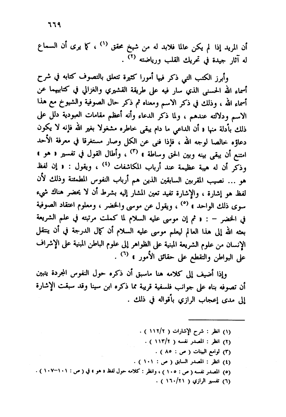 وأبرز الكتب التي ذكر فيها أموراً كثيرة تتعلق بالتصوف كتابه في شرح أسماء الله الحسنى الذي سار فيه على طريقة القشيري والغزالي في كتابيهما عن أسماء الله، وذلك في ذلك الاسم ومعناه ثم ذكر حال الصوفية والشيوخ مع هذا الاسم ودلالته عندهم، ولما ذكر الدعاء وأنه أعظم مقامات العبودية دلل على ذلك بأدلة منها " أن الداعي ما دام يبقى خاطره مشغولاً بغير الله فإنه لا يكون دعاؤه خالصاً لوجه الله، فإذا فنى عن الكل وصار مستغرقاً في معرفة الأحد امتنع أن يبقى بينه وبين الحق وساطة " (¬3) ، وأطال القول في تفسير " هو" وذكر أن له هيبة عظيمة عند أرباب المكاشفات (¬4) ، ويقول: " إن لفظ هو.. نصيب المقربين السابقين الذين هم أرباب النفوس المطمئنة وذلك لأن لفظ هو إشارة، والإشارة تفيد تعين المشار إليه بشرط أن لا يحضر هناك شيء سوى ذلك الواحد " (¬5) ، ويقول عن موسى والخضر، ومعلوم اعتقاد الصوفية في الخضر -: " ثم إن موسى عليه السلام لما كملت مرتبته في علم الشريعة بعثه الله إلى هذا العالم ليعلم موسى عليه السلام أن كمال الدرجة في أن ينتقل الإنسان من علوم الشريعة المبنية على الظواهر إلى علوم الباطن المبنية على الإشراف على البواطن والتقطع على حقائق الأمور" (¬6) .