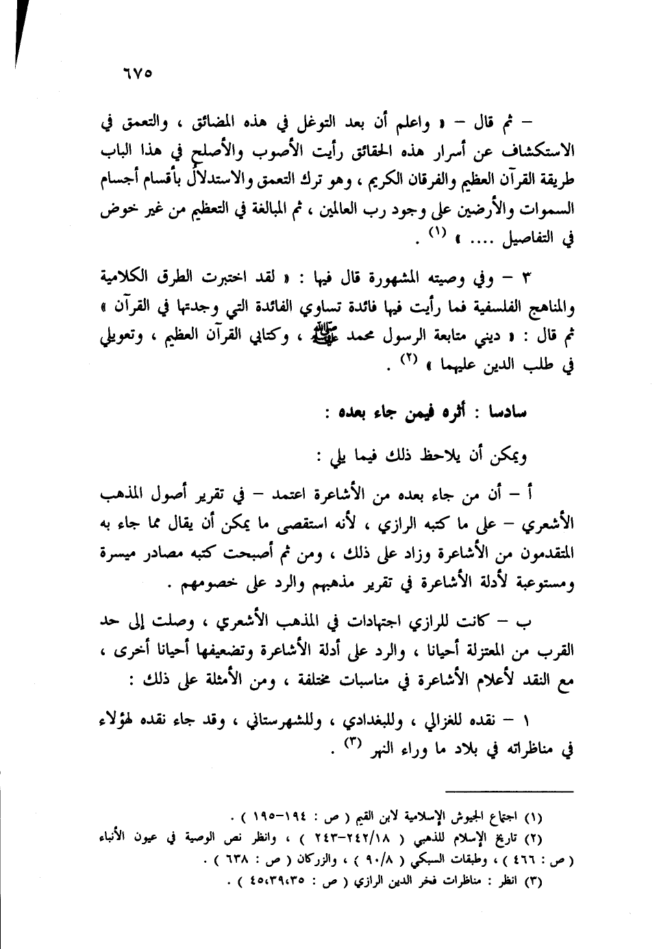 3- وفي وصيته المشهورة قال فيها: " لقد اختبرت الطرق الكلامية والمناهج الفلسفية فما رأيت فيها فائدة تساوي الفائدة التي وجدتها في القرآن " ثم قال: " ديني متابعة الرسول محمد - صلى الله عليه وسلم -، وكتابي القرآن العظيم، وتعويلي في طلب الدين عليهما " (¬2) .