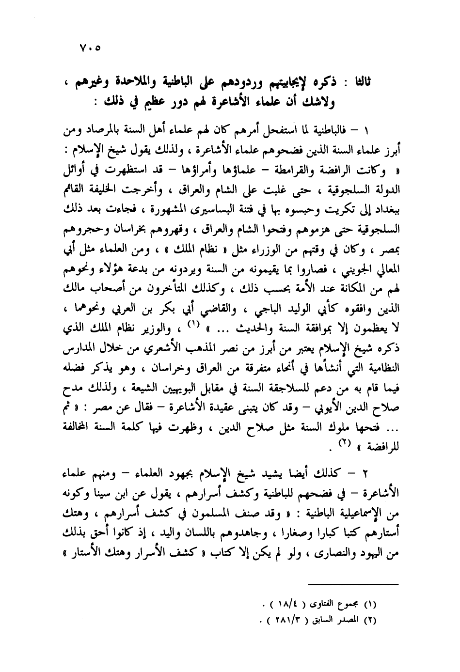 1- فالباطنية لما استفحل أمرهم كان لهم علماء أهل السنة بالمرصاد ومن أبرز علماء السنة الذين فضحوهم علماء الأشاعرة، ولذلك يقول شيخ الإسلام: " وكانت الرافضة والقرامطة- علماؤها وأمراؤها - قد استظهرت في أوائل الدولة السلجوقية، حتى غلبت على الشام والعراق، وأخرجت الخليفة القائم ببغداد إلى تكريت وحبسوه بها في فتنة البساسيري المشهورة، فجاءت بعد ذلك السلجوقية حتى هزموهم وفتحوا الشام والعراق، وقهروهم بخراسان وحجروهم بمصر، وكان في وقتهم من الوزراء مثل " نظام الملك"، ومن العلماء مثل أبي المعالي الجويني، فصاروا بما يقيمونه من السنة ويردونه من بدعة هؤلاء ونحوهم لهم من المكانة عند الأمة بحسب ذلك، وكذلك المتأخرون من أصحاب مالك الذين وافقهوه كأبي الوليد الباجي، والقاضي أبي بكر بن العربي ونحوهما، لا يعظمون إلا بموافقة السنة والحديث.." (¬1) ، والوزير نظام الملك الذي ذكره شيخ الإسلام يعتبر من أبرز من نصر المذهب الأشعري من خلال المدارس النظامية التي أنشأها في أنحاء متفرقة من العراق وخراسان، وهو يذكر فضله فيما قام به من دعم للسلاجقة السنة في مقابل البويهيين الشيعة، ولذلك مدح صلاح الدين الأيوبي - وقد كان يتبنى عقيدة الأشاعرة - فقال عن مصر: " ثم.. فتحها ملوك السنة مثل صلاح الدين، وظهرت فيها كلمة السنة المخالفة للرافضة " (¬2) .