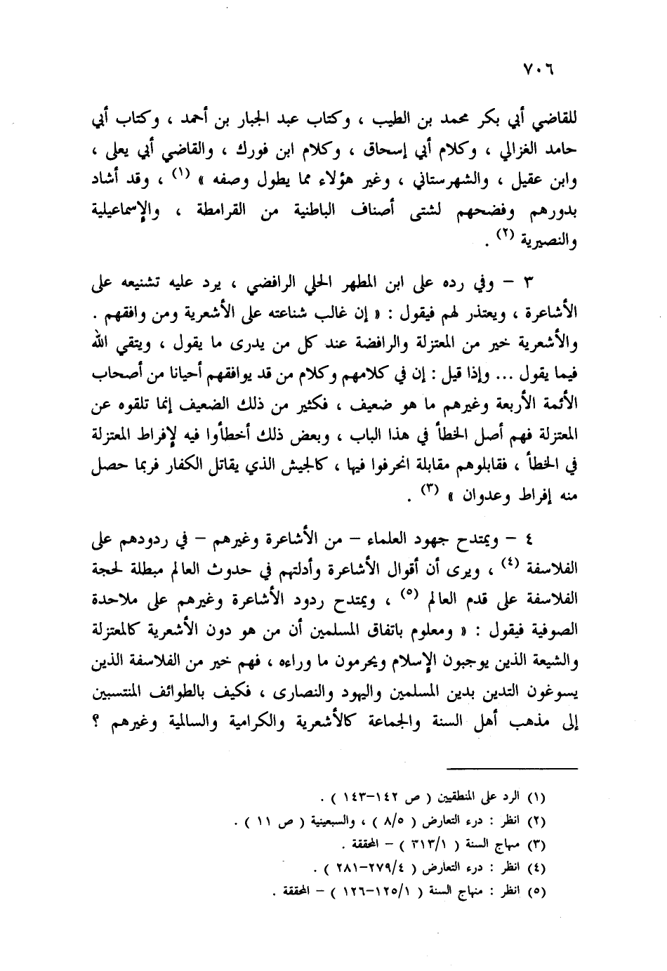 4- ويمتدح جهود العلماء - من الأشاعرة وغيرهم - في ردودهم على الفلاسفة (¬4) ، ويرى أن أقوال الأشاعرة وأدلتهم في حدوث العالم مبطلة لحجة الفلاسفة على قدم العالم (¬5) ، ويمتدح ردود الأشاعرة وغيرهم على ملاحدة الصوفية فيقول: " ومعلوم باتفاق المسلمين أن من هو دون الأشعرية كالمعتزلة والشيعة الذين يوجبون الإسلام ويحرمون ما وراءه، فهم خير من الفلاسفة الذين يسوغون التدين بدين المسلمين واليهود والنصارى، فكيف بالطوائف المنتسبين إلى مذهب أهل السنة والجماعة كالأشعرية والكرامية والسالمية وغيرهم؟