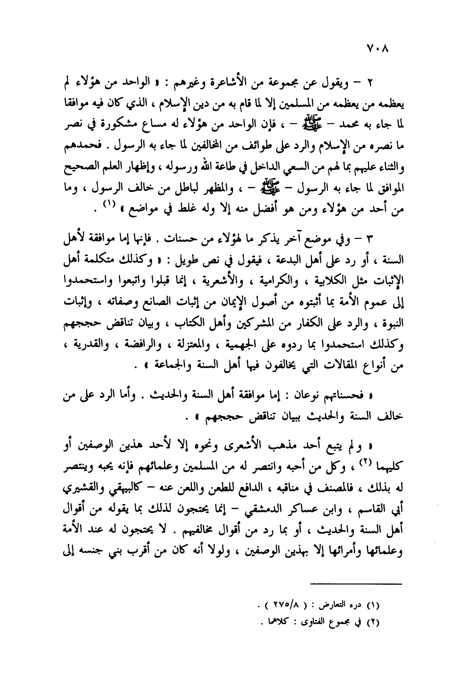 "ولم يتبع أحد مذهب الأشعري ونحوه إلا لأحد هذين الوصفين أو كليهما (2) ، وكل من أحبه وانتصر له من المسلمين وعلمائهم فإنه يحبه وينتصر له بذلك، فالمصنف في مناقبه، الدافع للطعن واللعن عنه - كالبيهقي والقشيري أبي القاسم، وابن عساكر الدمشقي - إنما يحتجون لذلك بما يقوله من أقوال أهل السنة والحديث، أو بما رد من أقوال مخالفيهم. لا يحتجون له عند الأمة وعلمائها وأمرائها إلا بهذين الوصفين، ولولا أنه كان من أقرب بني جنسه إلى