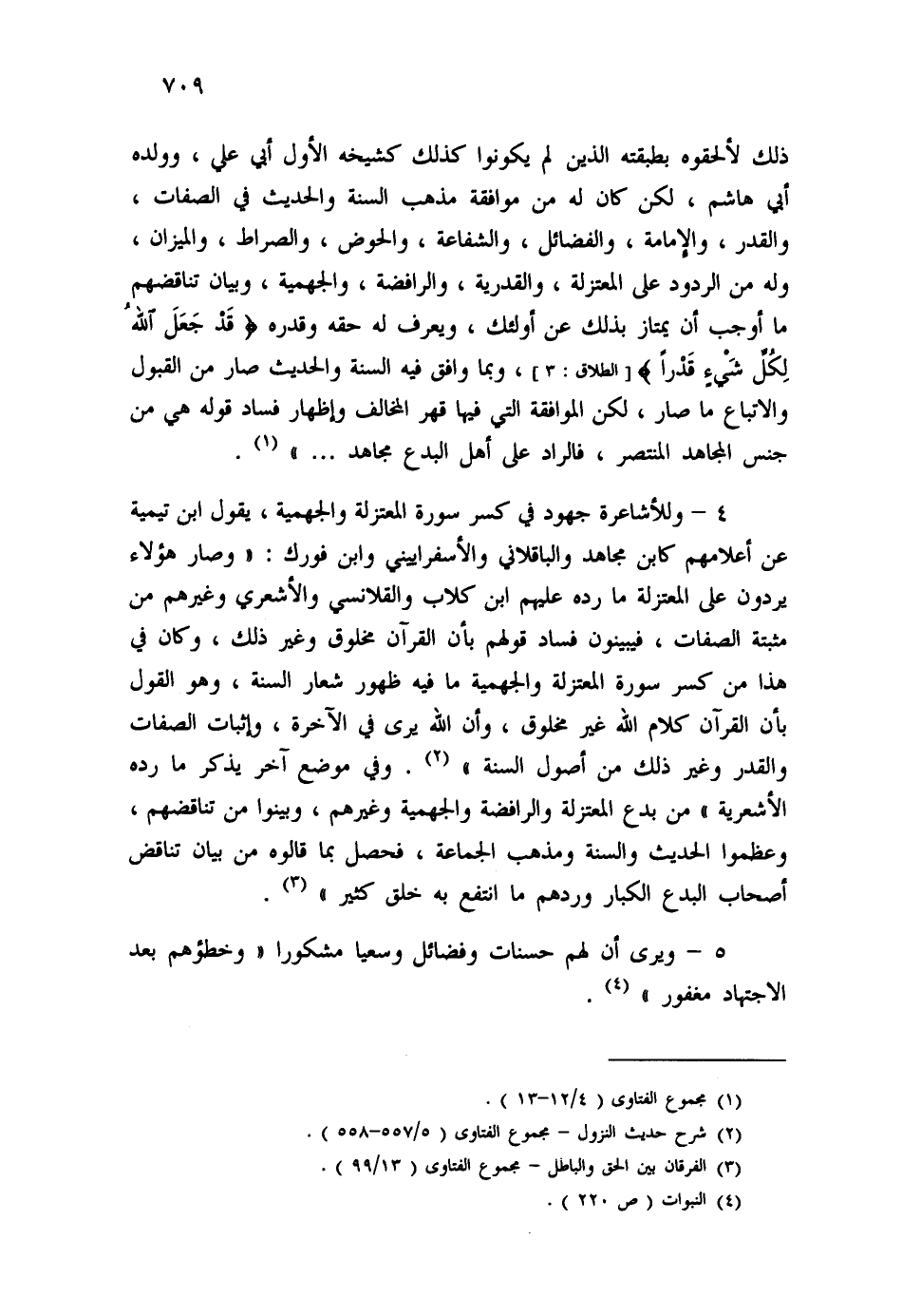 4- وللأشاعرة جهود في كسر سورة المعتزلة والجهمية، يقول ابن تيمية عن أعلامهم كابن مجاهد والباقلاني والأسفراييني وابن فورك: "وصار هؤلاء يردون على المعتزلة ما رده عليهم ابن كلاب والقلانسي والأشعري وغيرهم من مثبتة الصفات، فيبينون فساد قولهم بأن القرآن مخلوق وغير ذلك، وكان في هذا من كسر سورة المعتزلة والجهمية ما فيه ظهور شعار السنة، وهو القول بأن القرآن كلام الله غير مخلوق، وأن الله يرى في الآخرة، وإثبات الصفات والقدر وغير ذلك من أصول السنة " (2) . وفي موضع آخر يذكر ما رده الأشعرية " من بدع المعتزلة والرافضة والجهمية وغيرهم، وبينوا من تناقضهم، وعظموا الحديث والسنة ومذهب الجماعة، فحصل بما قالوه من بيان تناقض أصحاب البدع الكبار وردهم ما انتفع به خلق كثير " (3) .