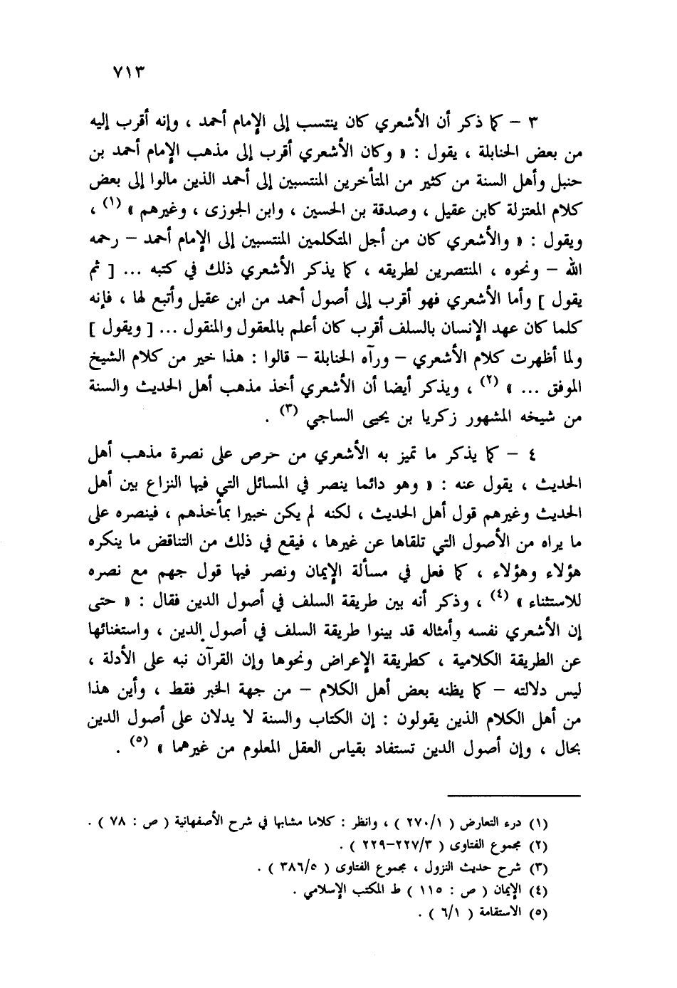 4- كما يذكر ما تميز به الأشعري من حرص على نصرة مذهب أهل الحديث، يقول عنه: " وهو دائماً ينصر في المسائل التي فيها النزاع بين أهل الحديث وغيرهم قول أهل الحديث، لكنه لم يكن خبيراً بمأخذهم، فينصره على ما يراه من الأصول التي تلقاها عن غيرها، فيقع في ذلك من التناقض ما ينكره هؤلاء هؤلاء، كما فعل في مسألة الإيمان ونصر فيها قول جهم مع نصره للاستثناء " (¬4) ، وذكر أنه بين طريقة السلف في أصول الدين فقال: " حتى إن الأشعري نفسه وأمثاله قد بينوا طريقة السلف في أصول الدين، واستغنائها عن الطريقة الكلامية، كطريقة الإعراض ونحوها وإن القرآن نبه على الأدلة، من أهل الكلام الذين يقولون: إن الكتاب والسنة لا يدلان على أصول الدين بحال، وإن أصول الدين تستفاد بقياس العقل المعلوم من غيرهما " (¬5) .