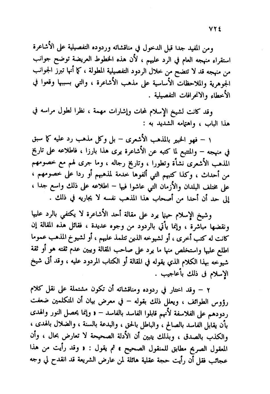 ومن المفيد جداً قبل الدخول في مناقشاته وردوده التفصيلية على الأشاعرة استقراء منهجه العام في الرد عليهم، لأن هذه الخطوط العريضة توضح جوانب من منهجه قد لا تتضح من خلال الردود التفصيلية المطولة، كما أها تبرز الجوانب الجوهرية والملاحظات الأساسية على مذهب الأشاعرة، والتي بسببها وقعوا في الأخطاء والانحرافات التفصيلية.