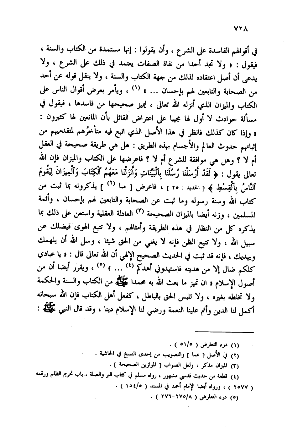 ويأمر بعرض أقوال الناس على الكتاب والميزان الذي أنزله الله تعالى، ليميز صحيحها من فاسدها، فيقول في مسألة حوادث لا أول لها على اعتراض القائل بأن المانعين لها كثيرون: " وإذا كان كذلك فانظر في هذا الأصل الذي اتبع فيه متأخرهم لمتقدميهم من إثباتهم حدوث العالم والأجسام بهذه الطريق: هل هي طريقة صحيحة في العقل أم لا؟ وهل هي موافقة للشرع أم لا؟ فاعرضها على الكتاب والميزان فإن الله تعالى يقول: {لَقَدْ أَرْسَلْنَا رُسُلَنَا بِالْبَيِّنَاتِ وَأَنْزَلْنَا مَعَهُمُ الْكِتَابَ وَالْمِيزَانَ لِيَقُومَ النَّاسُ بِالْقِسْطِ} (الحديد:25) ، فاعرض [ما (¬2) ] يذكرونه بما ثبت من كتاب الله والسنة رسوله وما ثبت عن الصحابة والتابعين لهم بإحسان، وأئمة المسلمين، وزنه أيضاً بالميزان الصحيحة (¬3) العادلة العقلية واستعن على ذلك بما يذكره كل من النظار في هذه الطريقة وأمثالهم، ولا تتبع الهوى فيضلك عن سبيل الله، ولا تتبع الظن فإنه لا يغني من الحق شيئاً، وسل الله أن يلهمك ويهديك، فإنه قد ثبت في الحديث الصحيح الإلهي أن الله تعالى قال: " يا عبادي كلكم ضال إلا من هديته فاستهدوني أهدكم (¬4) ... " (¬5) ،
